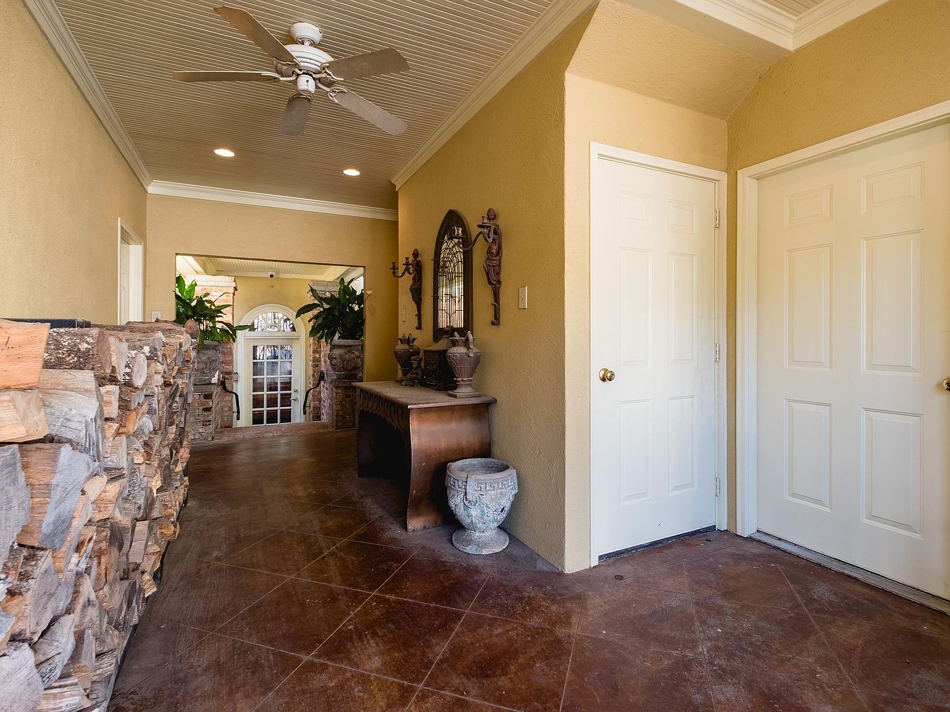This entryway features a warm, inviting atmosphere with a light ochre wall color that enhances the natural light flooding in from the doorway. The ceiling is adorned with a textured finish and a ceiling fan, promoting airflow. A rustic woodpile adds a cozy element along one side, while decorative pots with greenery soften the space. Opposite, a wooden console table with intricate detailing is accented by ornamental vases. Two white doors flank the entryway, providing access to separate rooms. The flooring is a rich, polished concrete with a diamond pattern, adding sophistication and charm.