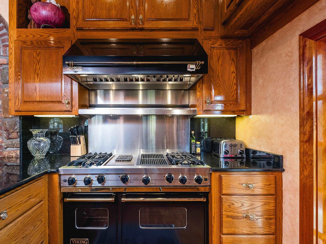This kitchen features rich wooden cabinetry with a warm oak finish, complementing the rustic aesthetics. A stainless steel Viking range with multiple burners takes center stage, flanked by a sleek stainless steel backsplash that reflects light. Dark granite countertops provide a striking contrast to the cabinetry and enhance functionality. A glass vase adds a touch of elegance, while kitchen essentials, such as knives and olive oil, are neatly arranged for convenience. The subtle color palette, including warm tones on the walls, contributes to the inviting atmosphere, making this space both stylish and practical for cooking and entertaining.
