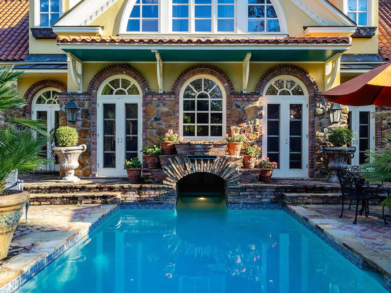 A serene pool area featuring vibrant turquoise water that mirrors the clear sky. Surrounding the pool are intricately laid stone and brick pathways, contributing to the rustic charm of the space. Tall, lush potted plants and flower arrangements add a splash of green and color, enhancing the inviting atmosphere. Elegant double doors with glass panels provide a seamless connection to the home, flanked by stone-clad walls that showcase texture and warmth. Above, a green overhang adds shade, while the architectural details, such as arched windows and a distinctive roof, are reminiscent of classic American design.