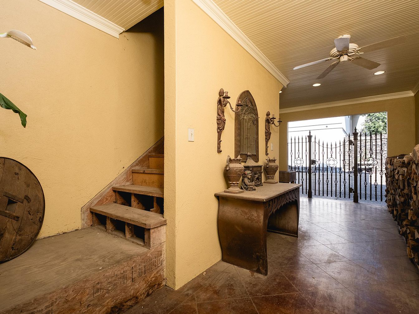The entryway features a warm, inviting atmosphere with soft yellow walls and a textured ceiling. An ornate wooden table, richly detailed with carved elements, stands against a wall adorned with decorative candle sconces. Stairs lead to an upper level, their rustic wooden steps adding character. To the right, a wrought iron gate provides a glimpse of the outdoor space, while a neatly stacked woodpile adds a sense of coziness. The polished floor reflects light, enhancing the openness of the area, while plants offer a touch of nature, bridging the transition from interior to exterior.
