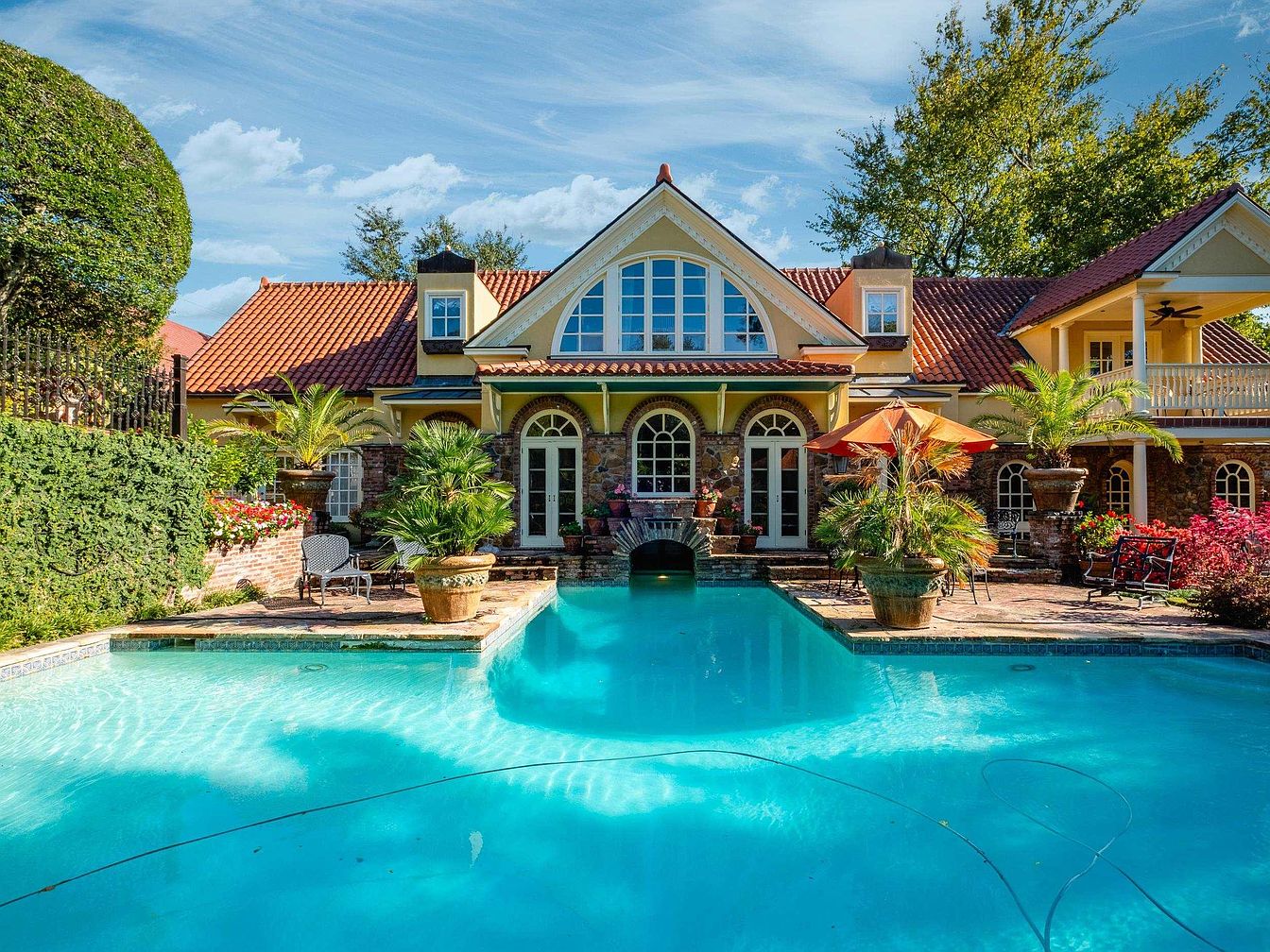 The image showcases a stunning poolside area of a historic American home. The pool, with its inviting turquoise waters, mirrors the clear blue sky overhead. Surrounding the pool are lush green palm trees and vibrant flower beds that enhance the tropical feel. A charming stone façade and large windows of the house create an elegant backdrop, while a terracotta roof adds warmth to the structure. Patio furniture, including wicker chairs and an orange umbrella, invites relaxation. The meticulous landscaping features potted plants, enhancing the property’s allure and providing a serene oasis for outdoor enjoyment.