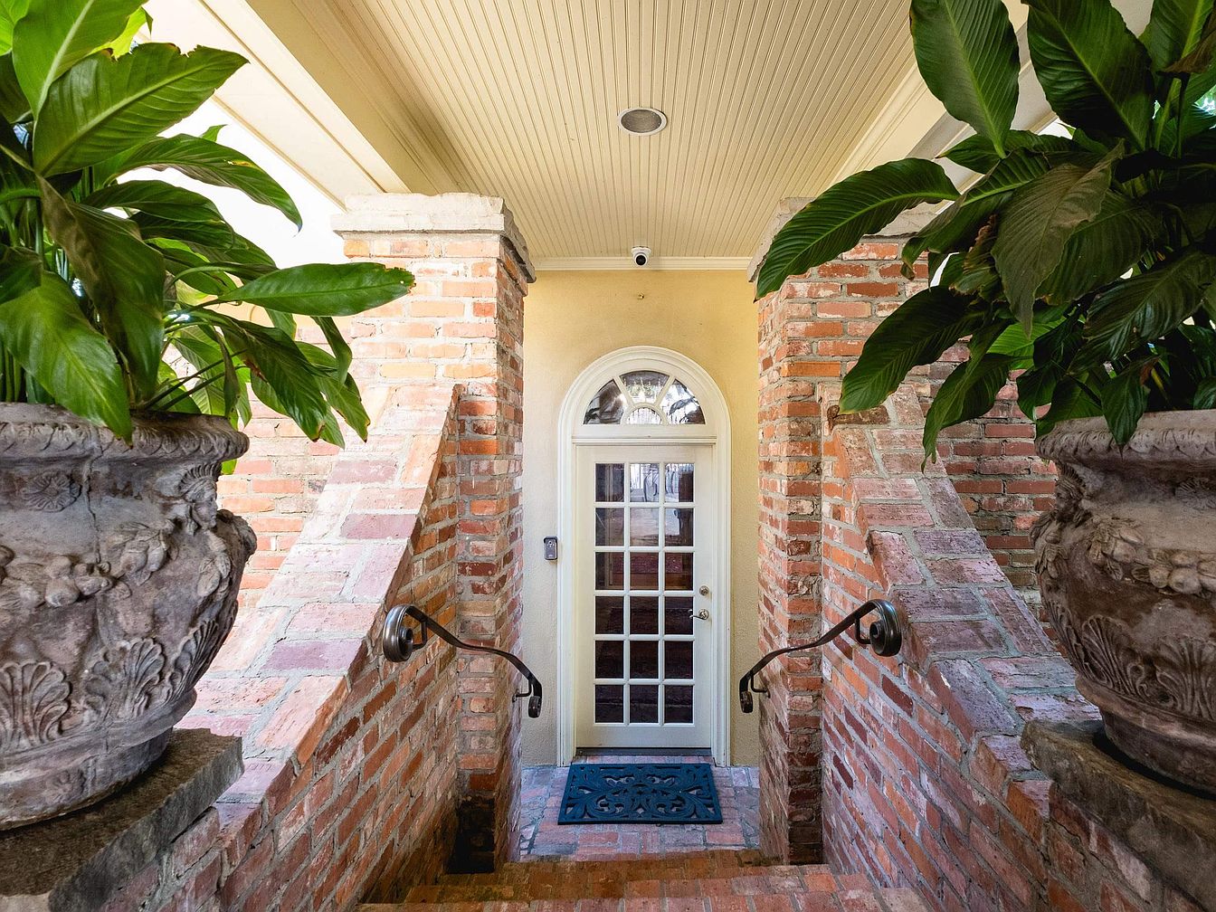 The front entrance features a charming, inviting space framed by lush greenery in large stone planters. A set of stairs leads up to a grand, glass-paneled door, surrounded by elegant brick walls that showcase a warm, reddish tone. The entrance is adorned with subtle architectural details including a high, coffered ceiling and polished wooden accents. An antique-style dark metal handrail guides visitors up the steps, enhancing the refined aesthetic. The terracotta-colored bricks contrast beautifully with the light hues of the wall, providing depth and character to this welcoming threshold.