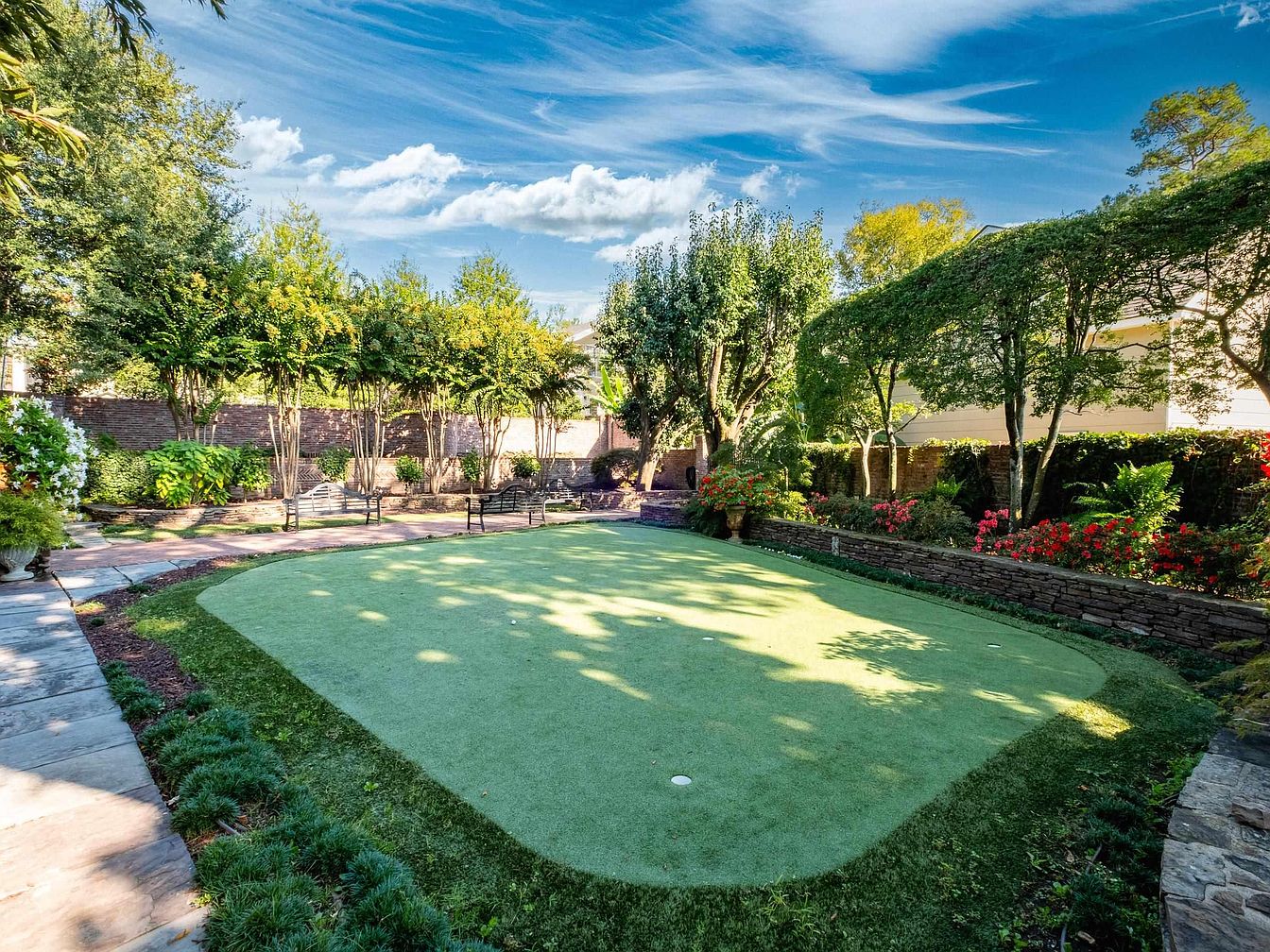 The image showcases a spacious garden featuring a tranquil swimming pool surrounded by meticulously manicured hedges and vibrant greenery. Distinctive rooflines of nearby homes, adorned with terracotta shades, complement the rich landscape. A plush lawn integrates with stone pathways, leading to various recreational areas, including a small golf putting green. Trees provide dappled sunlight, enhancing the serene ambiance. Several cozy sitting spots invite relaxation amid the lush scenery. The architecture reflects a blend of traditional styles, with elements like tall windows and charming chimneys adding character, while fenced borders create an intimate enclosure, promoting privacy.