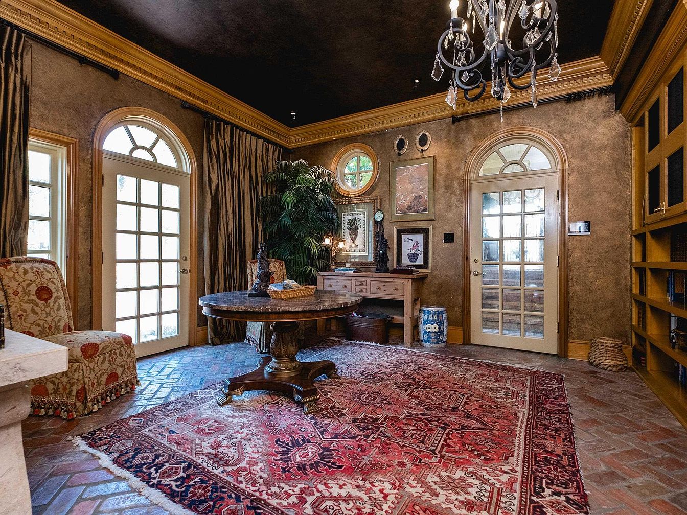 The entry hall features an ornate design with high ceilings adorned by an elegant chandelier. Richly textured walls in warm earthy tones complement the deep, colorful area rug positioned on a terra cotta tiled floor. Two large, arched windows allow natural light to flood the space, revealing luxurious drapery that adds softness. A round marble-topped table is centrally placed, surrounded by cozy, upholstered seating that invites conversation. Antique-styled furnishings, including a wooden dresser and decorative accents on the walls, contribute character. This inviting space merges traditional aesthetics with a touch of sophistication.