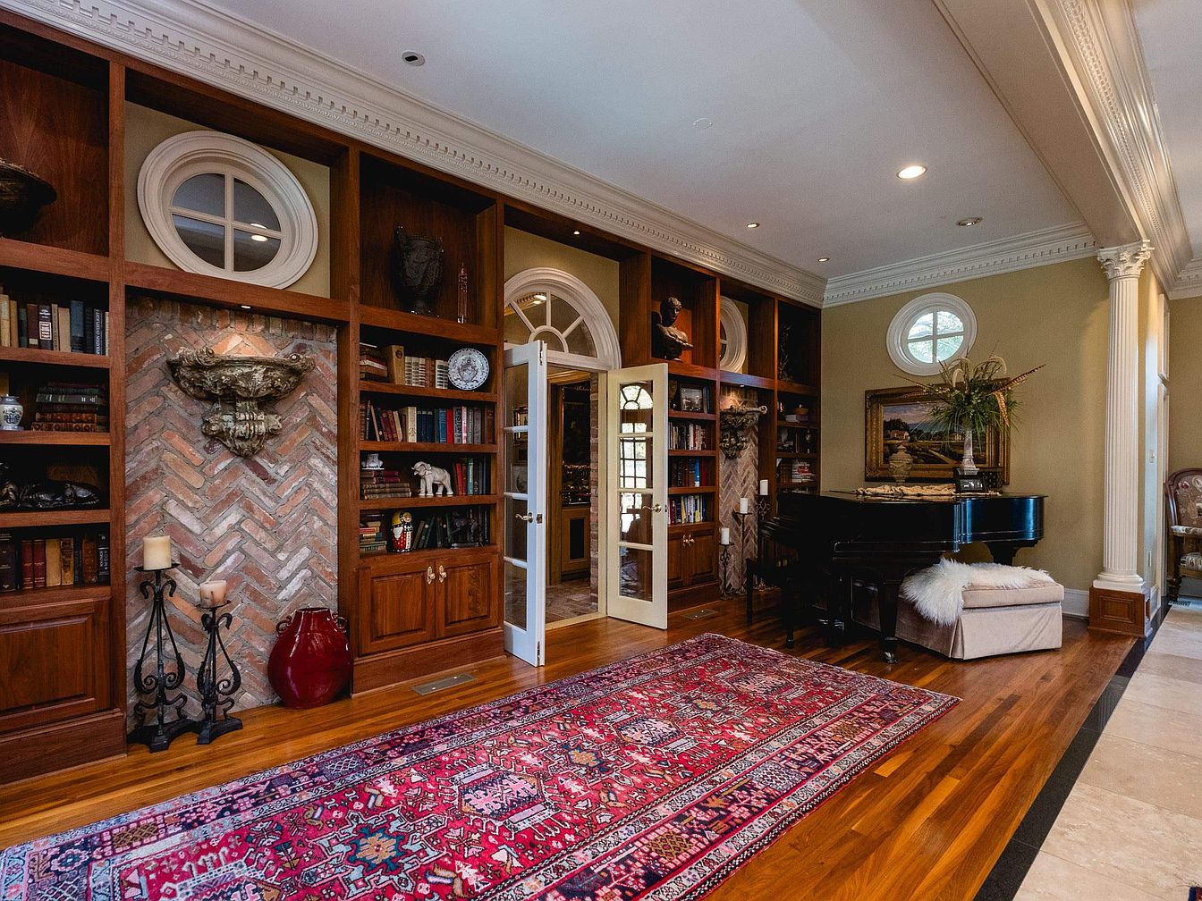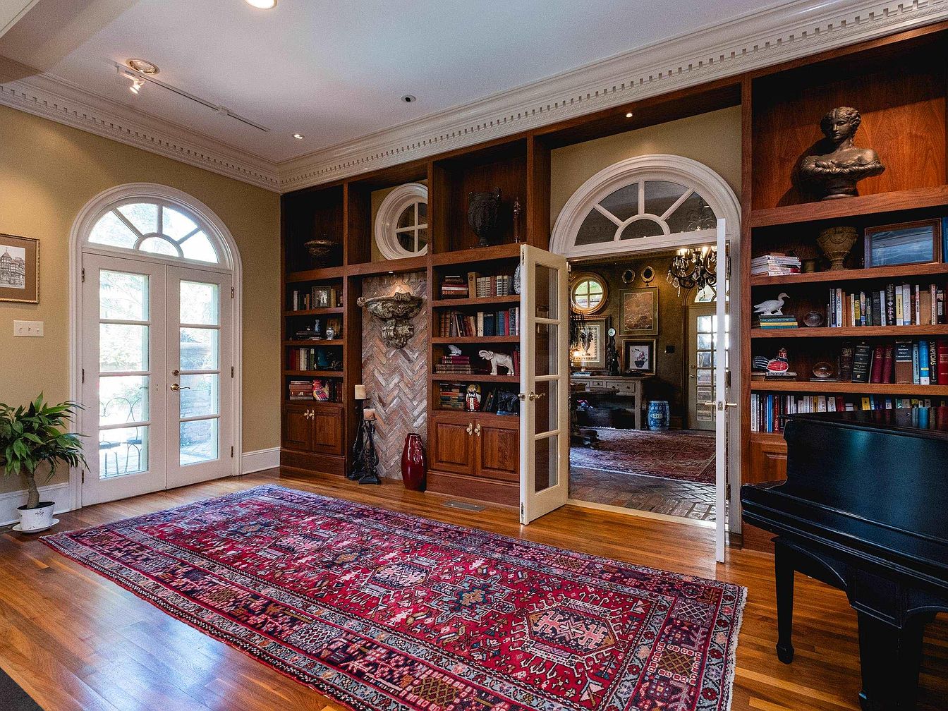 This elegant living room features rich wooden bookshelves filled with books and decorative items, enhanced by a warm color palette of earthy tones. A striking brick wall in a herringbone pattern adds texture behind the shelves. A grand black piano occupies one corner, accompanied by a plush white seat, inviting creativity. The intricate Persian rug adds splashes of vibrant color, contrasting beautifully with the polished hardwood floor. Stylish tall candle holders and a striking red vase add an artistic touch, while tall windows with circular tops allow ample natural light to fill the space, enhancing its inviting atmosphere.