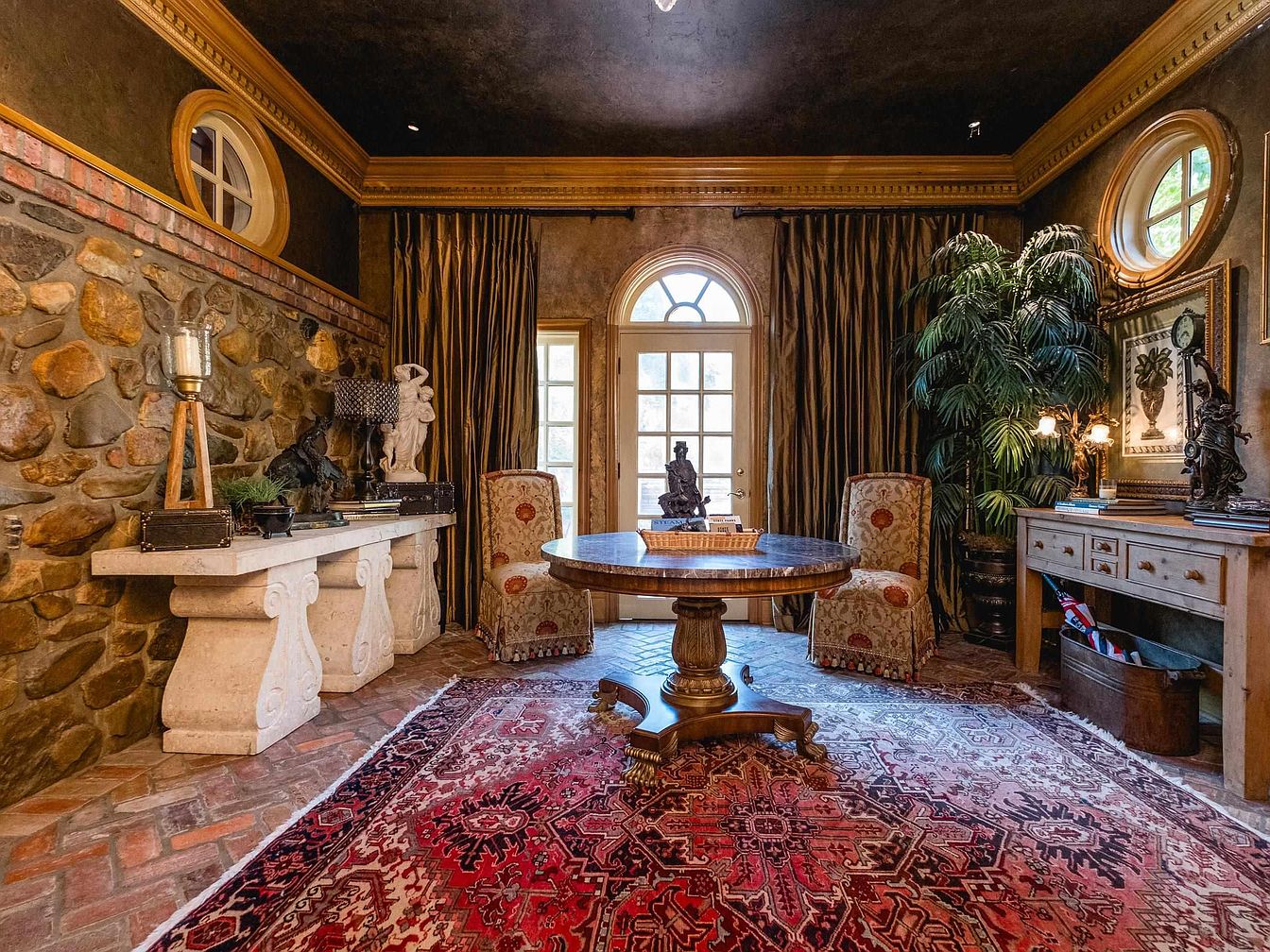 A cozy sitting room showcases rustic charm with a stunning exposed stone wall that adds warmth and texture. Rich, dark curtains frame tall windows, while strategically placed lamps and greenery introduce a lively touch. A round wooden table serves as the centerpiece, complemented by plush, intricately patterned chairs, creating inviting seating. The well-laid herringbone floor features warm brick tones, harmonizing beautifully with a vibrant area rug adorned with intricate motifs. Architectural details such as gold accents on the ceiling and a unique sculpture collection enhance the aesthetic, offering a seamless blend of elegance and comfort.