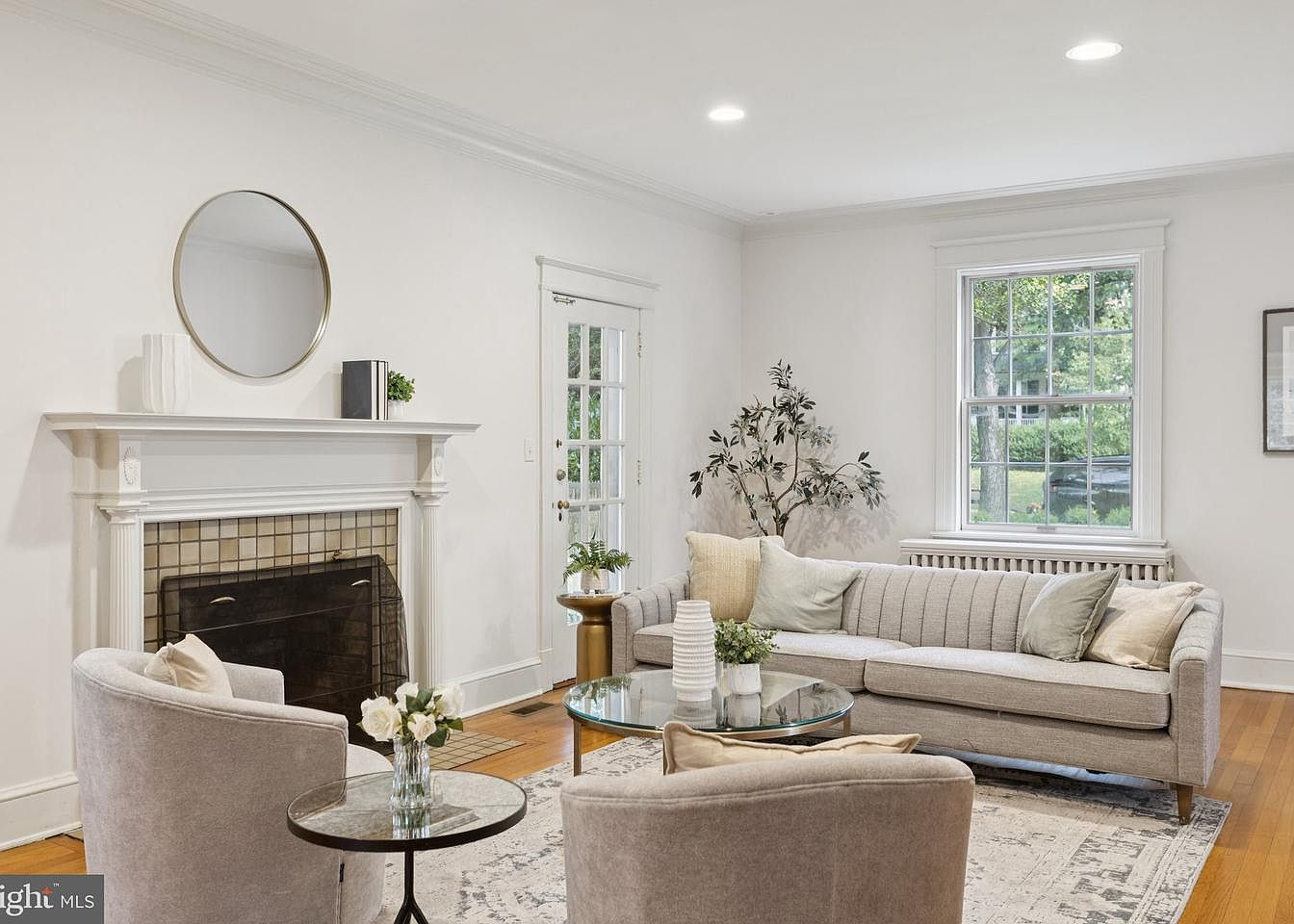 This living room features a cozy layout with soft gray upholstery on the seating, complemented by a light, neutral color palette. A large round mirror above the mantel enhances the open feel of the space, reflecting light from two recessed ceiling fixtures. The fireplace, with its classic detail and tiled surround, serves as a focal point. A glass coffee table, accompanied by smaller side tables, adds modern elegance. Natural light pours in through the generous window, framed by classic white trim. Scenic greenery outside is visible, while a subtle area rug adds warmth underfoot, enhancing the inviting atmosphere.