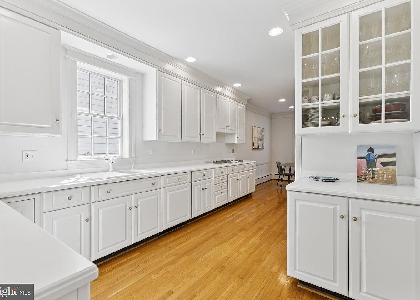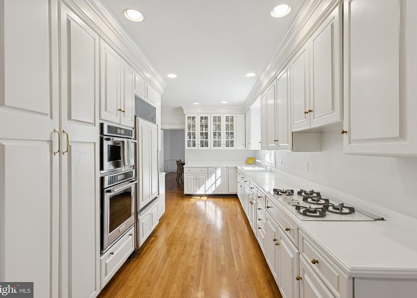 This contemporary kitchen features an elongated layout with gleaming white cabinetry that creates a bright, airy atmosphere. The cabinets are accented with brushed gold hardware, adding warmth to the space. A sleek white countertop runs alongside, complementing the cabinetry and providing ample workspace. Built-in appliances, including double ovens and a gas cooktop, sit seamlessly integrated into the cabinetry. Large windows allow natural light to flood the room, enhancing the polished wood floor which provides a rich contrast. A glass-front cabinet showcases elegant glassware, inviting organization and style, while recessed lighting adds functionality and ambiance.