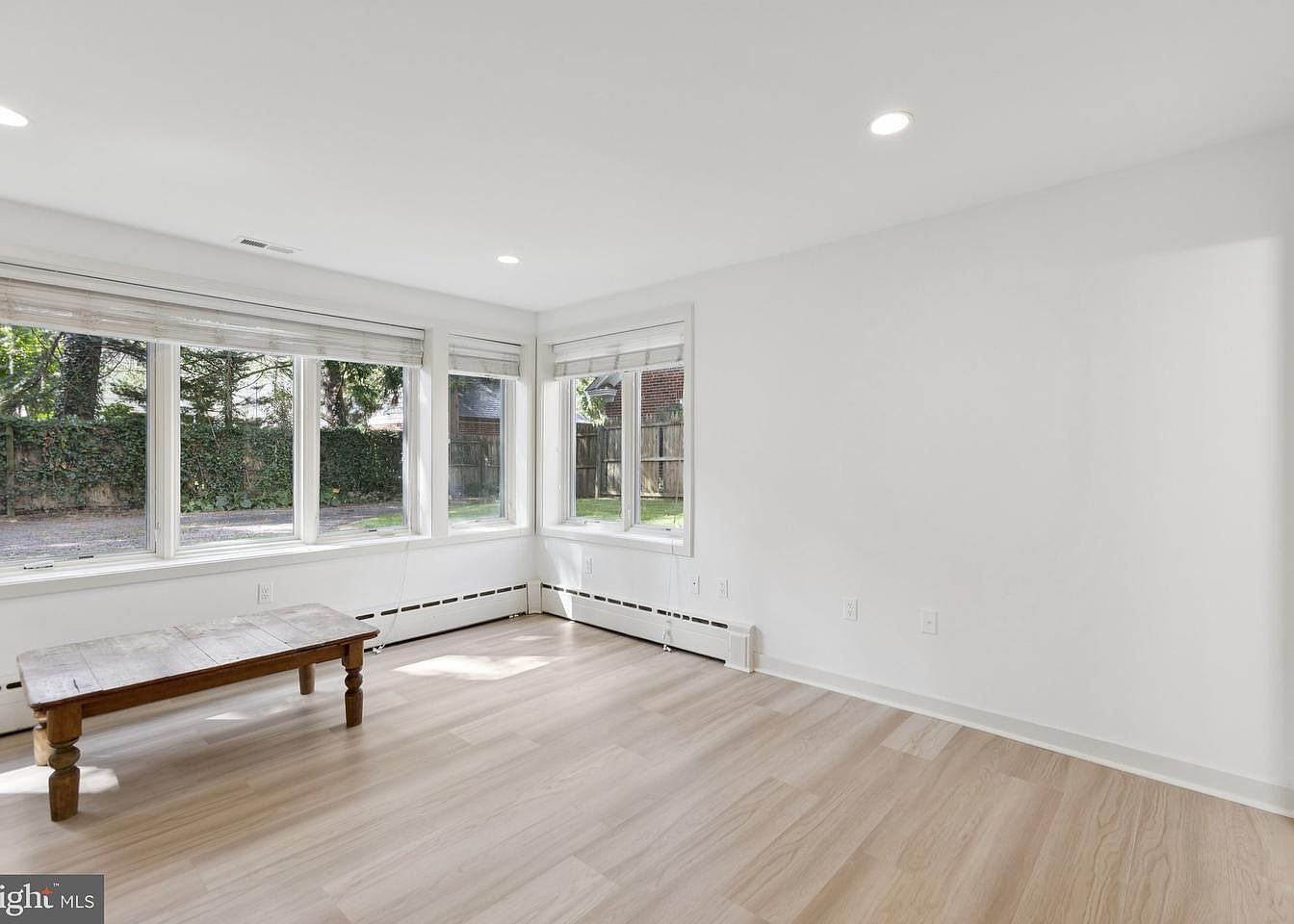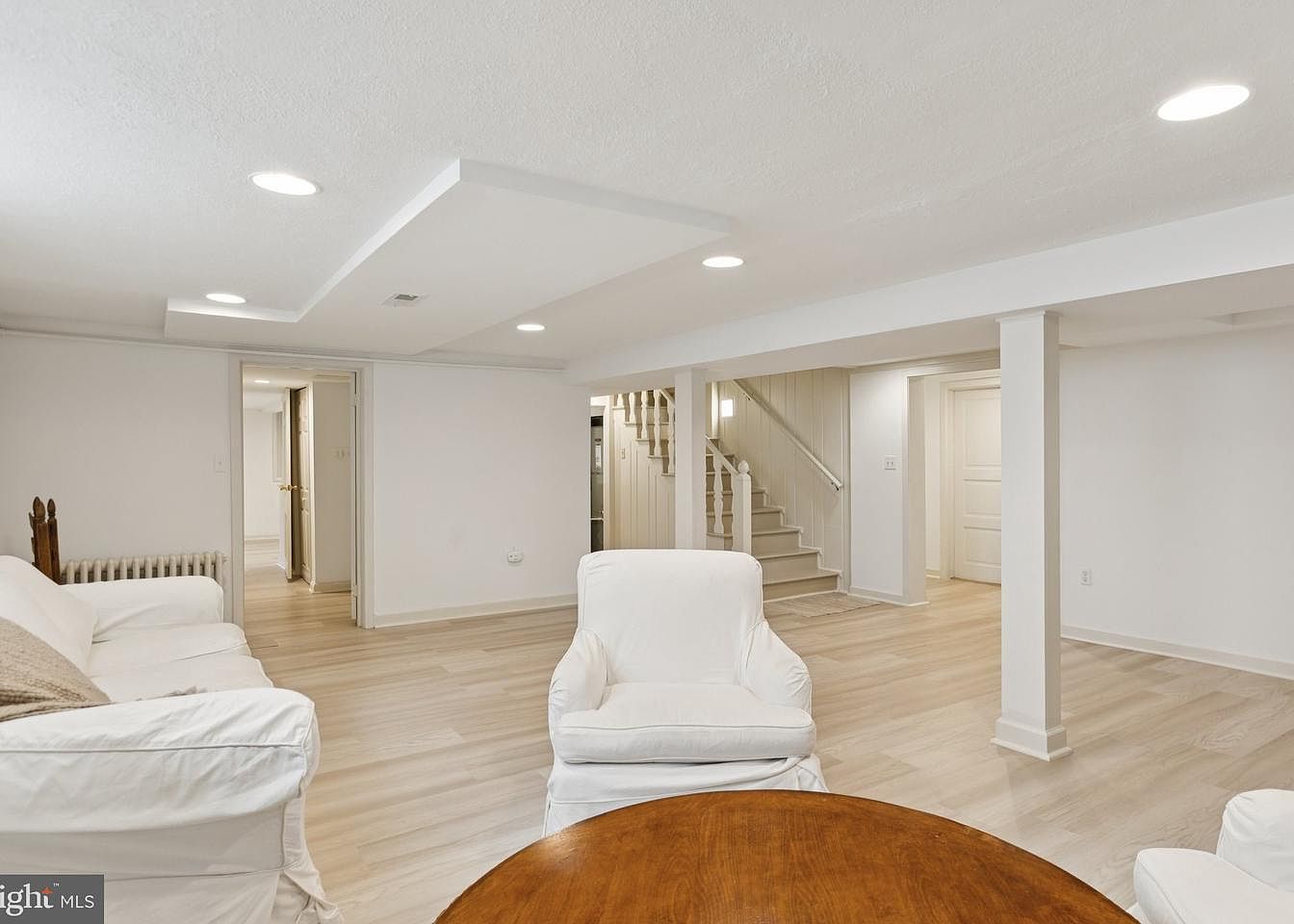 A spacious basement lounge area features light hardwood flooring and white walls, creating a bright, airy atmosphere. Two plush white armchairs are positioned around a circular wooden table, inviting relaxation and social interaction. Recessed lighting in the ceiling provides effective illumination. In the background, a staircase with wooden railings leads to another level, blending functionality with design. The warm tones of the table contrast with the neutral palette, while a vintage radiator adds a hint of classic charm. The overall layout emphasizes openness, making the space feel larger while accommodating both comfort and style.