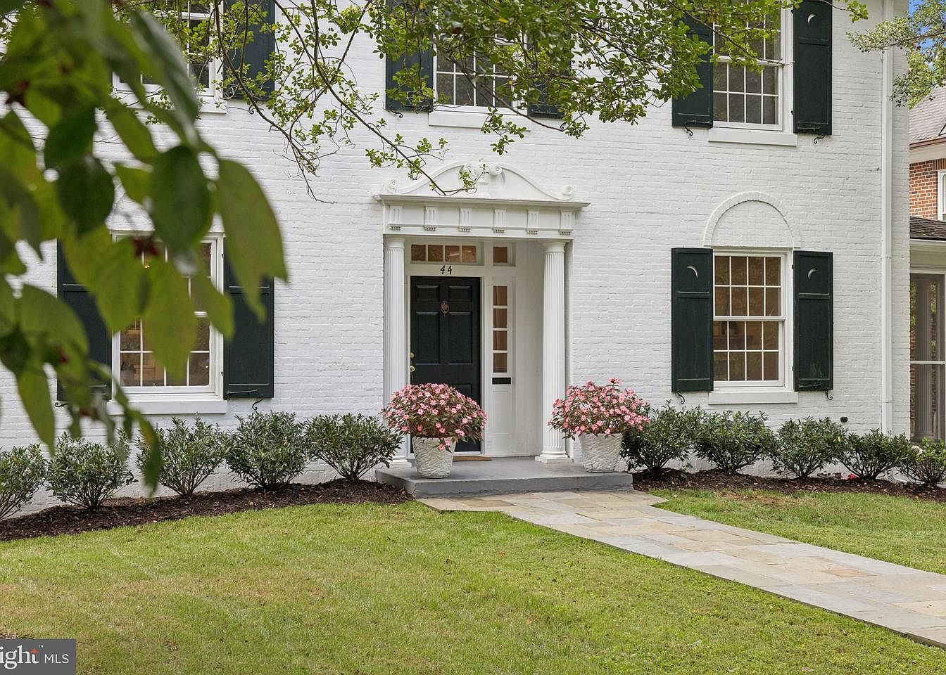 The front facade of this historic American home features a classic symmetrical design with a bright white brick exterior. Flanking the central, striking black door are large windows, adorned with deep green shutters that enhance the traditional charm. Above the doorway, an elegant architectural pediment draws attention. A stone pathway leads to the entrance, bordered by neatly manicured shrubs. Decorative planters filled with vibrant flowers add a touch of color, softening the overall look. The gently sloping lawn complements the structure, while surrounding trees provide shade, enhancing the inviting, residential atmosphere.