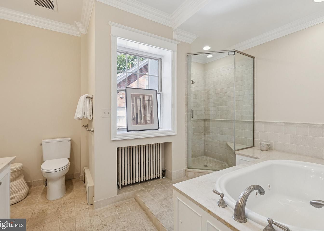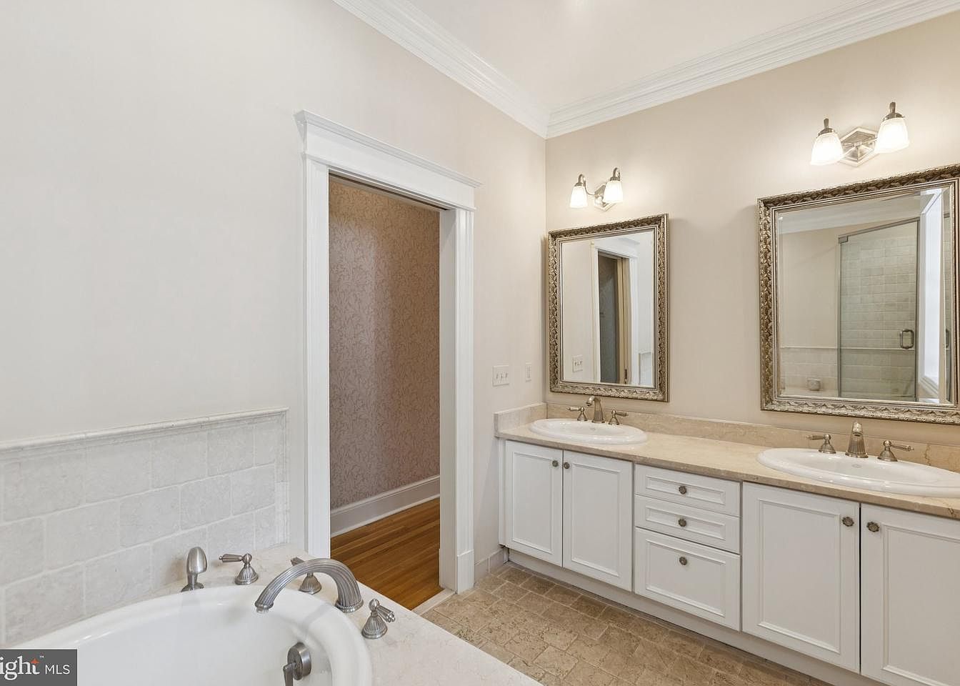 The bathroom features a modern yet timeless design, characterized by a neutral color palette of soft beige and white. Dual sinks are positioned beneath elegantly framed mirrors, enhancing the sense of space and light. High-quality fixtures in a brushed nickel finish complement the aesthetic. The countertop is a light-colored stone, harmonizing with the well-crafted cabinetry that offers ample storage. Off to the side, a doorway leads to a neat private area. The floor boasts laid stone tiles, lending an earthy vibe, while the ceiling’s ornate crown molding adds a touch of traditional charm to the overall serene atmosphere.