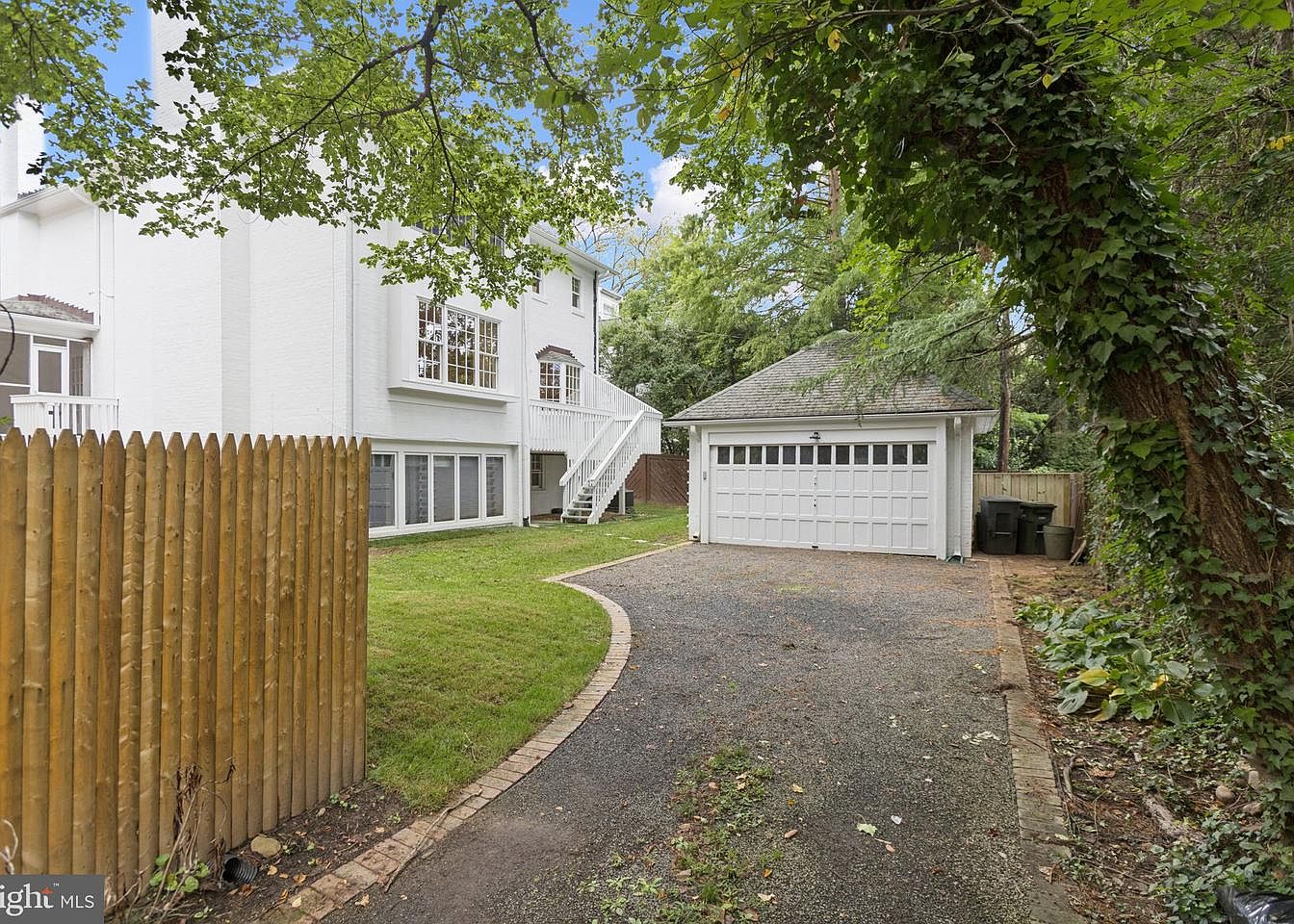 The image shows the exterior of a historic American home with a classical white facade. Lush green trees surround the property, providing a natural canopy. The house features large multi-paned windows that allow ample light and a welcoming atmosphere. A wooden fence borders the yard, complementing a neatly manicured lawn. A gravel driveway curves toward a spacious detached garage, which has a distinct sloped roof and multiple windows. Steps lead to an upper deck area, enhancing the two-level design. The overall aesthetic combines elegance with a serene, nature-integrated environment, highlighting the home’s timeless charm.