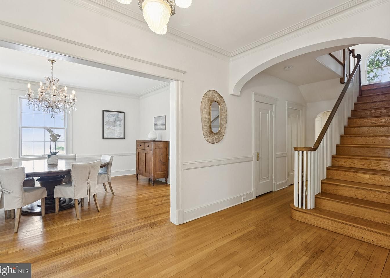 A warm entryway welcomes with natural wood flooring, leading to a staircase that spirals elegantly to the upper level. The walls are painted a soft white, allowing light to reflect through expansive windows. An ornate chandelier hangs from the ceiling, casting a gentle glow over a round dining table bordered by plush fabric chairs. A wooden cabinet stands against the wall, complemented by decorative artwork that enhances the aesthetic. A sleek mirror with a woven frame adds depth, while classic molding frames the space, merging modern simplicity with traditional charm.