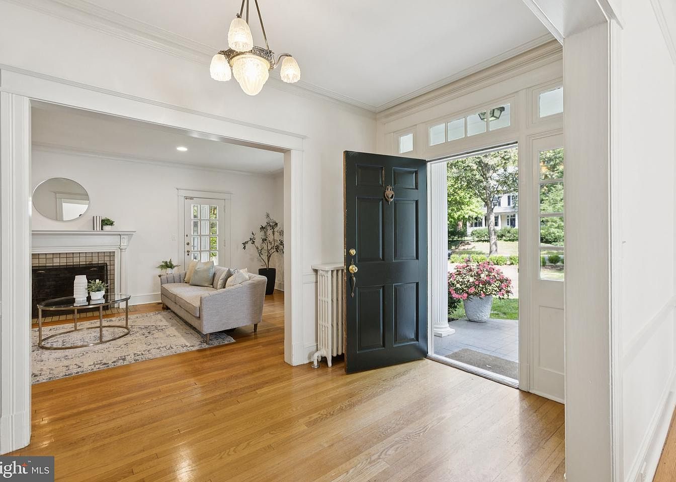 Bright and inviting entryway featuring a dark green front door that opens to a well-lit space. Natural light pours in from sidelights and a window above the door, illuminating the polished hardwood floor. Straight ahead, an archway leads to a cozy living area with a light gray sofa and a decorative area rug beneath a circular glass coffee table. A white mantel with a simple mirror adds elegance, while potted plants and decorative books enhance the welcoming atmosphere. The architectural details, like crown molding and baseboards, speak to classic design, creating a seamless flow between the entryway and living space.