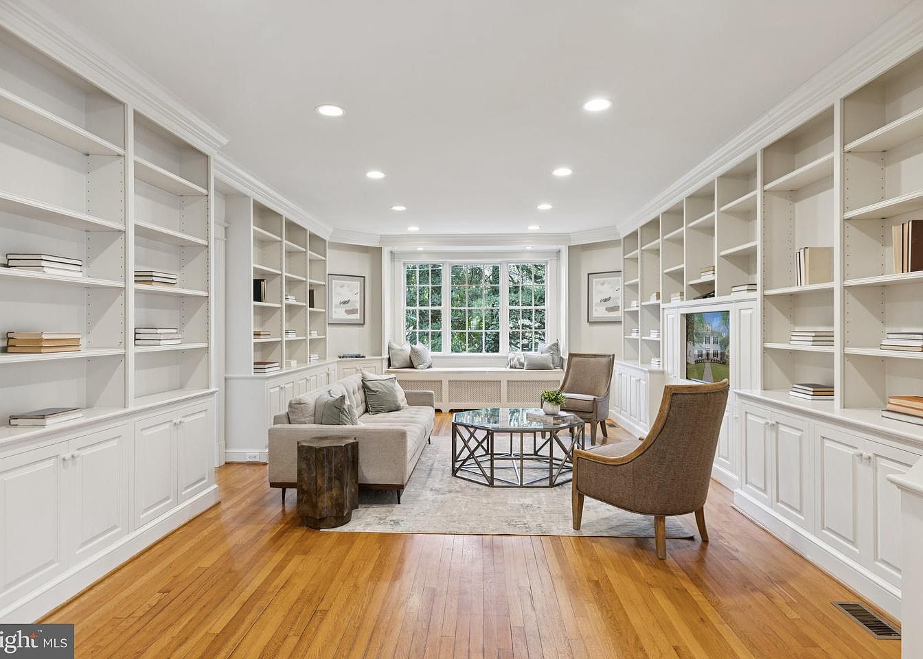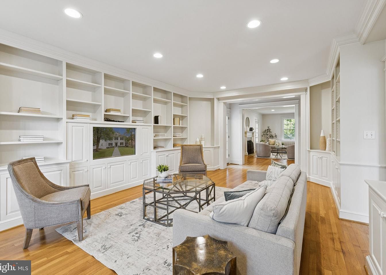A beautifully designed living room features built-in white bookcases on either side, harmonizing with a soft gray palette on the walls. Natural light floods the room through large windows, creating an inviting ambiance. The seating arrangement includes a light beige sofa adorned with pillows, complemented by two elegant armchairs with a warm, earthy tone. A round glass coffee table, set atop a muted area rug, adds a contemporary touch. The hardwood flooring exudes warmth, further enhanced by decorative plant accents and framed artworks, creating a cozy yet sophisticated aesthetic perfect for relaxation or conversation.