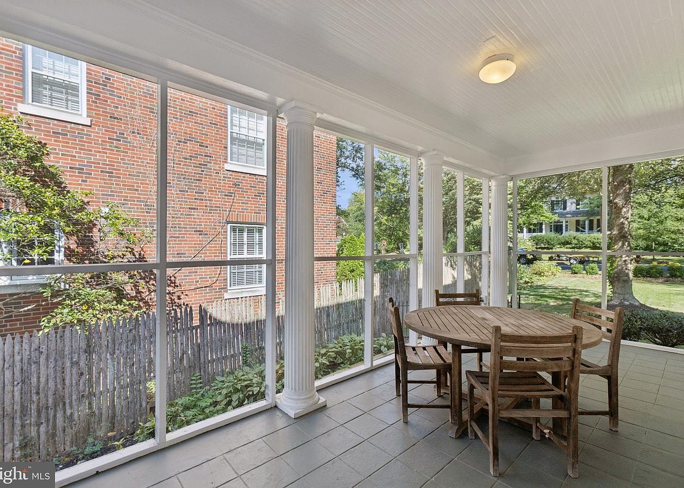 This sunroom features a spacious layout filled with natural light from large glass panels. The walls are framed by elegant white columns, complementing the classic feel of the space. A round wooden dining table is set in the center, surrounded by matching wooden chairs, creating an inviting atmosphere. The floor is covered with gray tiles, enhancing the bright and airy ambiance. Views of the landscaped yard are visible through the glass, integrating the outdoors with indoor comfort. Lush greenery and a rustic wooden fence outside add a serene touch, perfect for casual dining or relaxing.