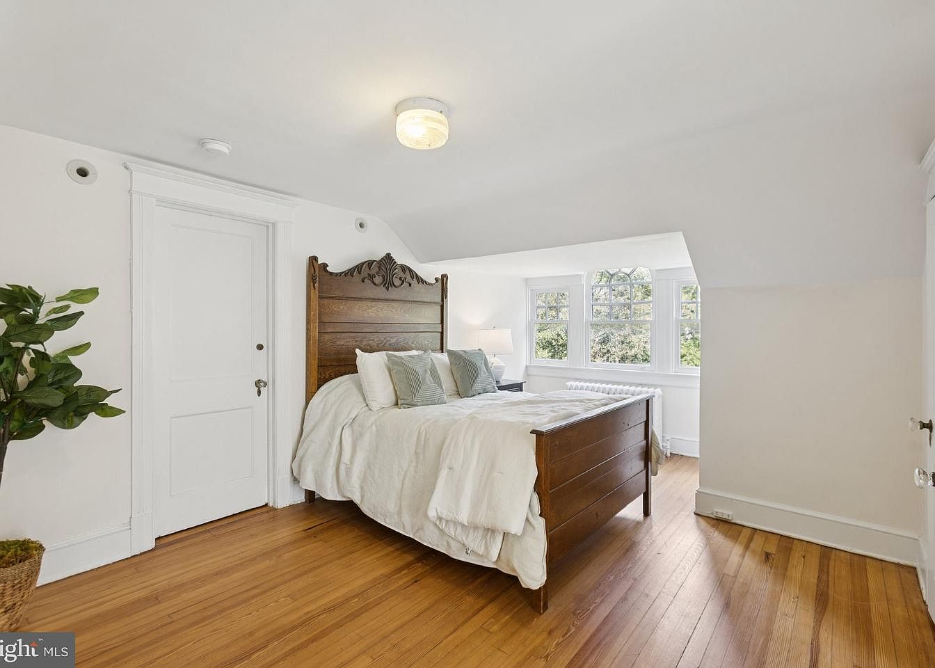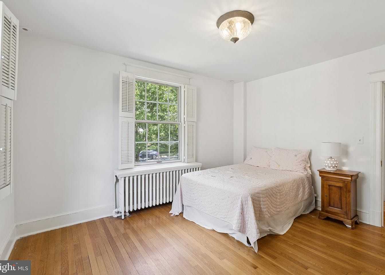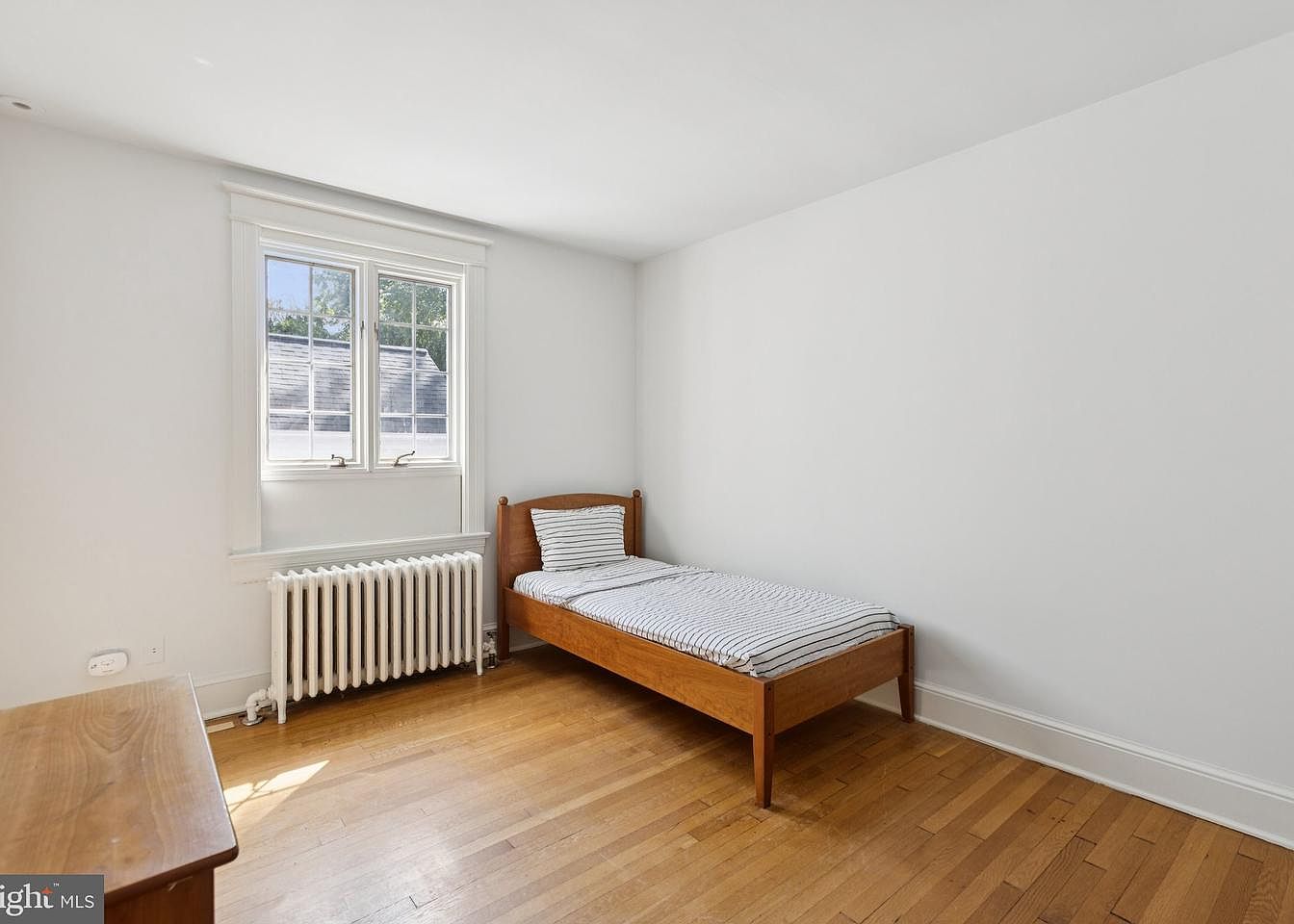 This bedroom features a simple and minimalist aesthetic, with soft white walls that emphasize spaciousness. Natural light floods through a two-pane window, highlighting the medium-toned hardwood floor. A classic wooden bed with a horizontal-striped bedding offers a cozy focal point, while the structured lines of the bed frame complement the clean design. A vintage-style radiator sits beneath the window, adding a charming touch. A modest wooden dresser, placed against one wall, enhances functionality. The overall atmosphere is serene and uncluttered, perfect for restful living and personal reflection.