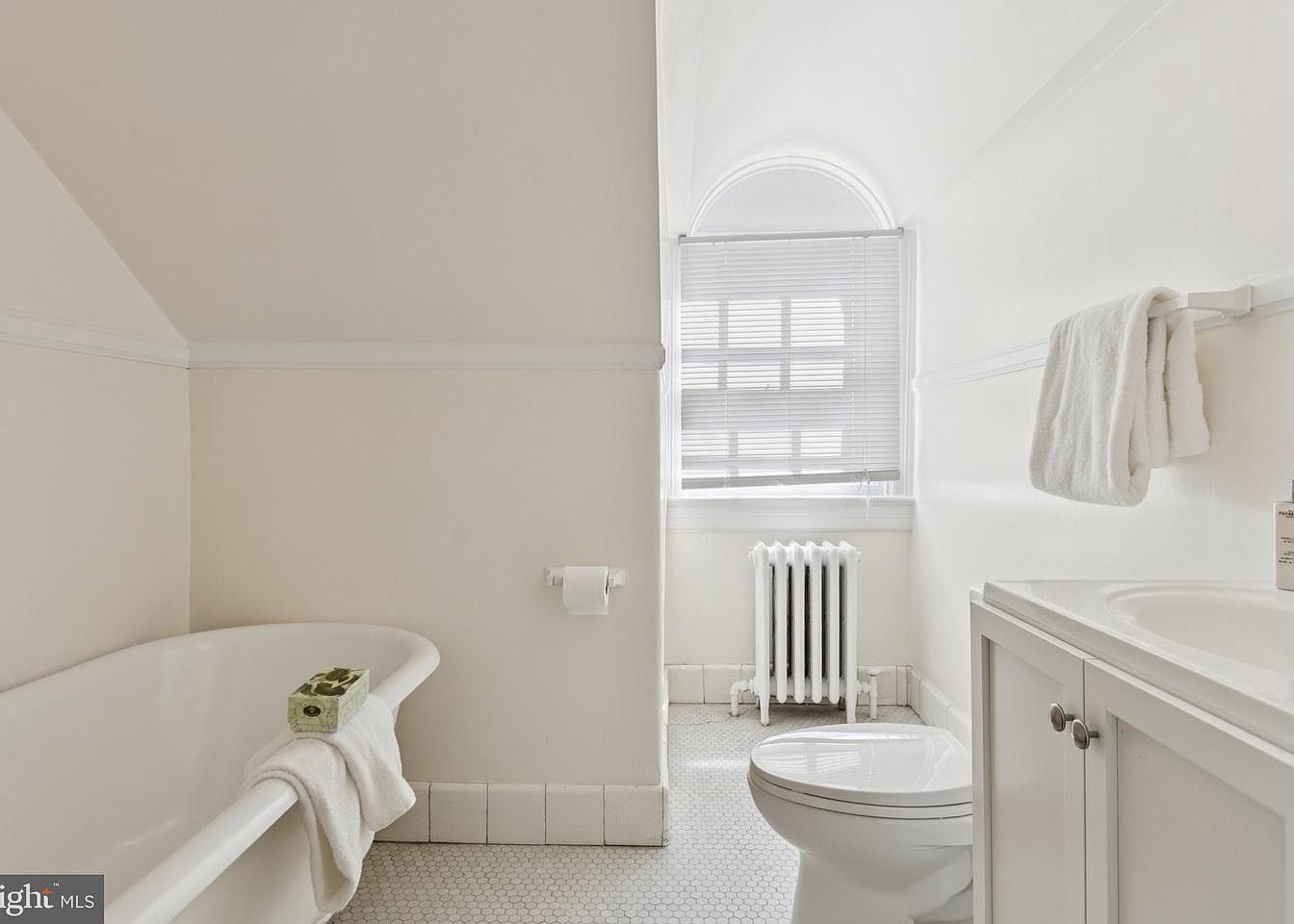 This bathroom features a classic layout with a freestanding white bathtub prominently situated against the wall. The room is painted in soft beige hues, enhancing its spacious feel. A large window dressed with horizontal blinds allows natural light to filter through, illuminating the subtle architectural details, like the curved ceiling. Hexagonal tile flooring in muted tones complements the overall aesthetic. A white cabinet under the sink provides storage, while a white towel rack neatly holds plush towels. The presence of a compact radiator adds warmth, completing this tranquil and inviting space.