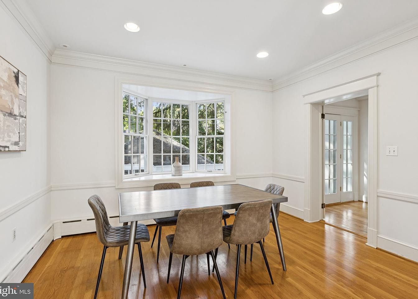 This dining area features a modern table positioned centrally, surrounded by six plush, upholstered chairs with subtle diamond patterns. The light wood flooring adds warmth to the space, complemented by white wainscoting that enhances the room’s elegance. A large bay window allows natural light to flood the area, showcasing views of the outside greenery. The walls are painted in a soft white hue, creating a bright and airy atmosphere. A minimalist artwork hangs on the wall, adding a touch of elegance. An adjoining room is accessed through a glass-panel door, introducing more light into the overall design.