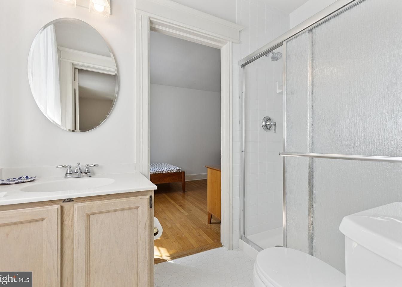 The bathroom features a clean, modern design with soft white walls and a bright, airy ambiance. A circular mirror above the white sink adds a sleek touch, reflecting natural light. Light wood cabinetry beneath the sink complements the hexagonal white tile flooring. On one side, a glass shower enclosure with a polished chrome handle creates an open feel. Visible through the doorway, a cozy bedroom with simple furnishings, including a wooden bed frame with striped bedding, hints at a seamless flow of space. Overall, the aesthetics highlight a blend of functionality and minimalist style, promoting serenity.
