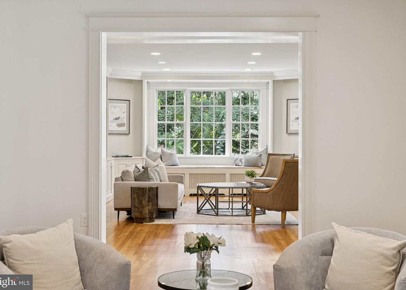 A bright and inviting living room features a spacious layout. Light hardwood floors complement the soft neutral wall colors, enhancing the airy feel. The centerpiece is a low, modern coffee table made of metal and glass, surrounded by two stylish armchairs and a comfortable sectional sofa adorned with lush pillows. A cozy window seat lined with cushions invites relaxation, while large, multi-paned windows flood the room with natural light and showcase greenery outside. Elegant wall art hangs on either side, and a delicate floral arrangement sits on a sleek side table, adding a touch of warmth and style.
