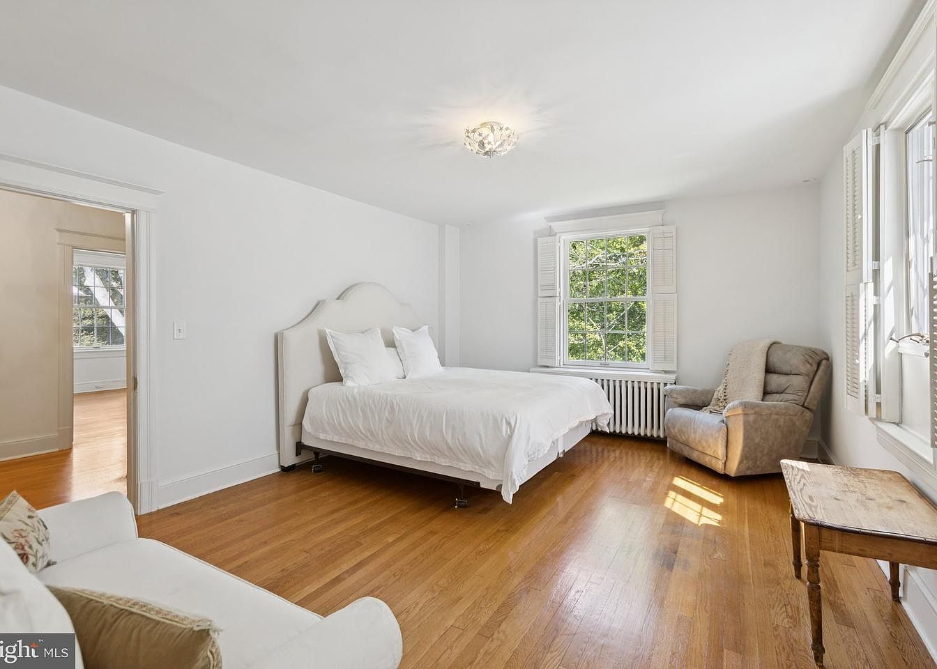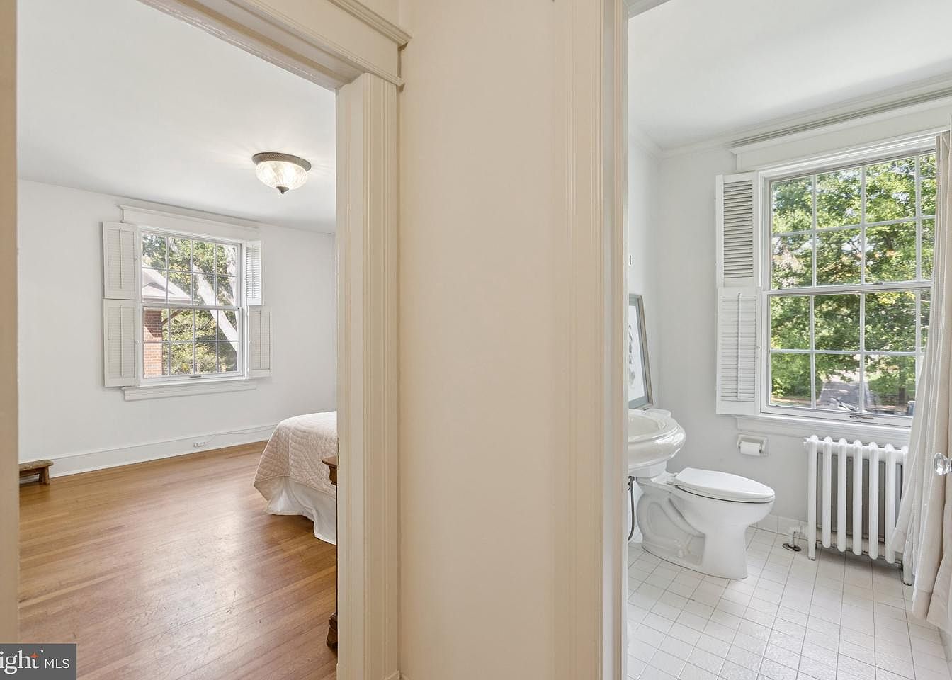 The image shows a doorway leading from a bedroom into a bright bathroom. Natural light pours in through large windows, featuring classic shutters, casting soft shadows. The room boasts a clean, minimalist aesthetic with white walls and light-colored flooring. A quaint pedestal sink occupies the space adjacent to a modern toilet, complemented by a decorative mirror. To the right, a vintage-style radiator adds a touch of charm. Light wood accents can be seen in the nearby area, enhancing warmth. The overall atmosphere is airy and inviting, reflecting a balance between functionality and timeless design.