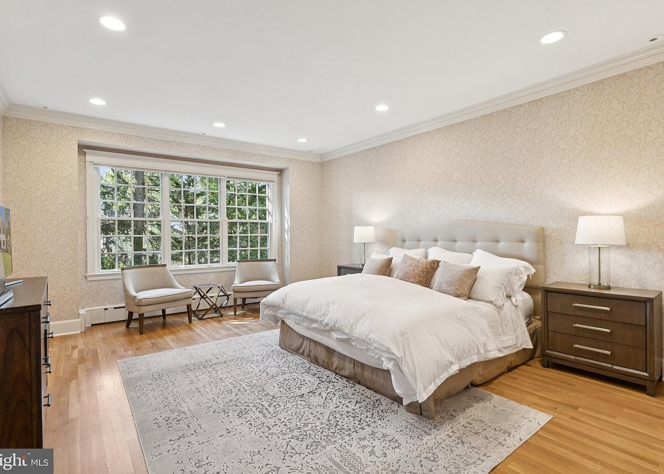 This spacious bedroom features a serene color scheme, highlighted by soft beige and whites. A plush king-sized bed with fluffy pillows sits against a textured, pale-patterned wall. Two elegant accent chairs with light upholstery flank a sleek, circular table by the window, allowing natural light to flood the room through a grand window. A soft area rug with intricate designs lies beneath the bed, complementing the hardwood floor’s warm tones. Modern nightstands with brushed metal accents provide functionality. Recessed lighting adds a cozy ambiance, making the space inviting and tranquil, perfect for relaxation.