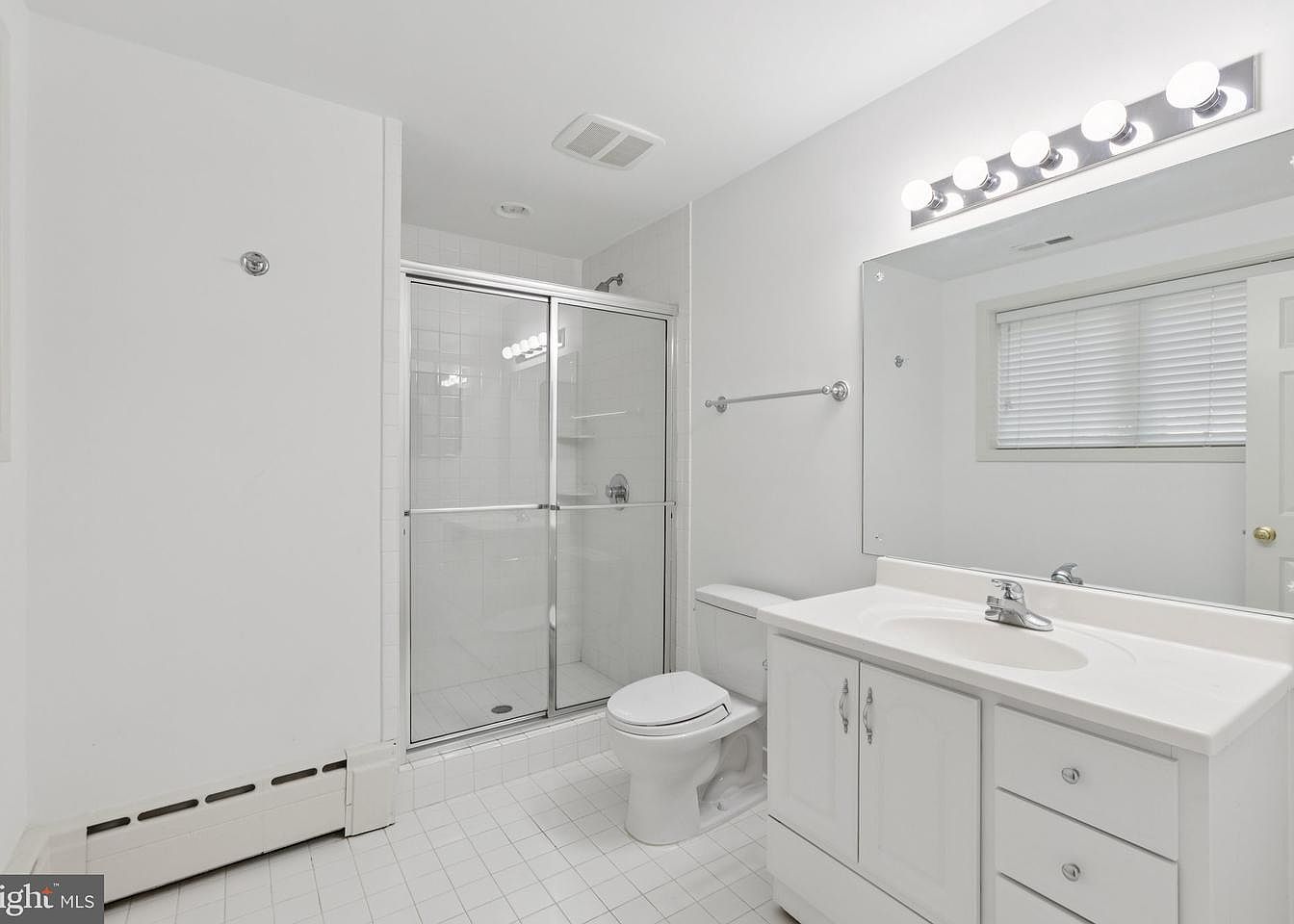 A bright and airy bathroom featuring a neutral color palette dominated by white. The space includes a glass-enclosed shower with clean lines, alongside a white toilet and a sleek vanity with white cabinetry and a smooth countertop. A large mirror above the sink reflects light, amplified by a row of five circular vanity lights, adding modern touches to the space. Square white tiles cover the floor and extend partially up the walls, enhancing the clean aesthetic. Natural light filters in through a window with blinds, ensuring privacy while brightening the overall atmosphere.