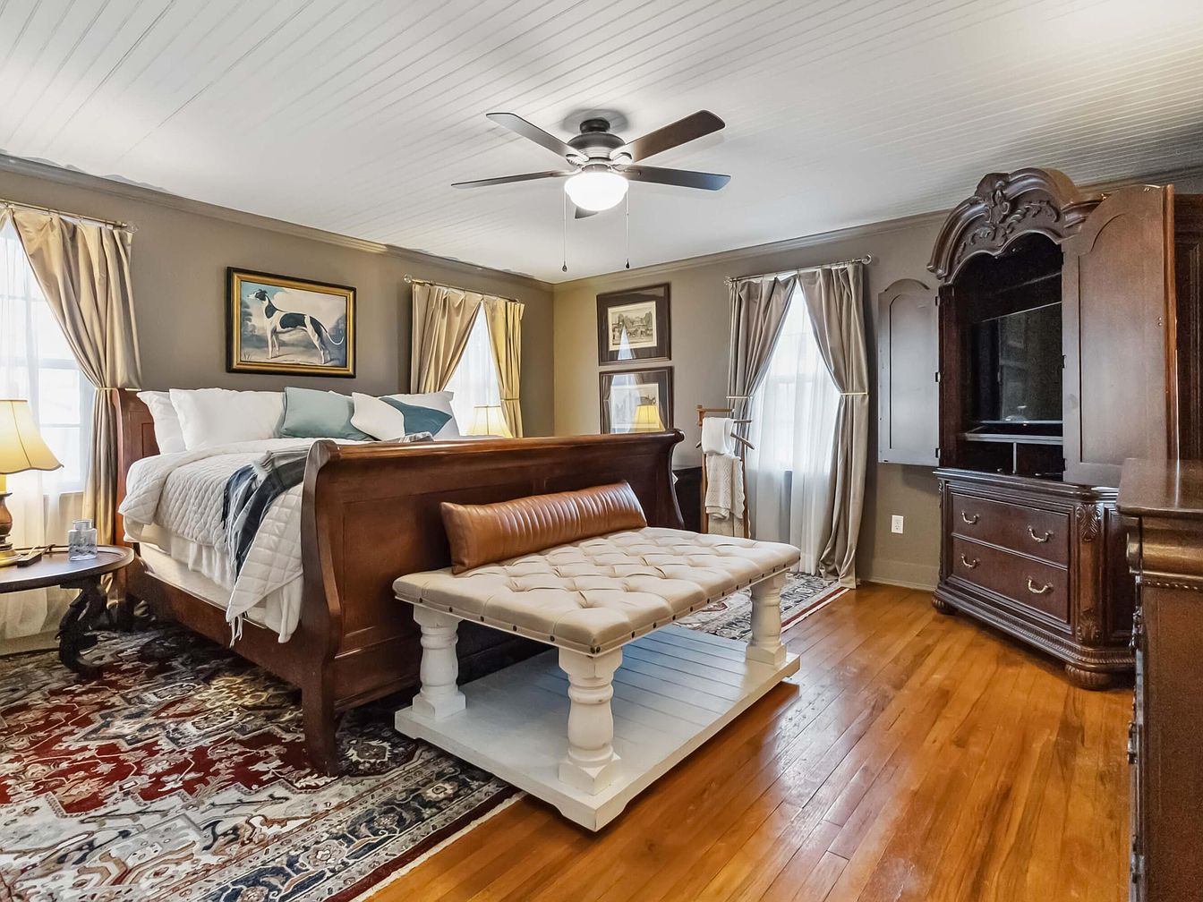 This space features a grand bed with an elegant wood sleigh frame, topped with crisp white bedding and accent pillows in muted blues and grays. At the foot of the bed sits a tufted white bench with a brown leather cushion, adding both comfort and visual interest. The hardwood floors are mostly covered by a rich, patterned area rug in shades of red, blue, cream, and taupe. Soft beige walls are lined with large windows draped in thick, satin curtains that bring in abundant light. Opposite the bed is an ornate, dark wood armoire, complementing the other traditional furnishings. Framed artwork and a ceiling fan complete this refined atmosphere.