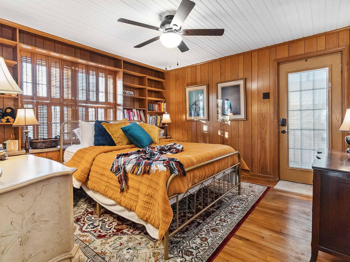 Warm wood paneling covers the walls, complemented by a white beadboard ceiling with a dark ceiling fan and lamp. A bed with mustard yellow and deep blue throw pillows sits against a wall of built-in bookshelves and shuttered windows. The bedding, textured and inviting, is paired with a colorful plaid throw. The room features a wide oriental-patterned rug over light hardwood floors, giving a cozy feel. Framed art hangs on the wall beside a glass-paned door, which leads outside. Classic wooden furniture and softly glowing table lamps finish the welcoming, vintage-inspired ambiance.
