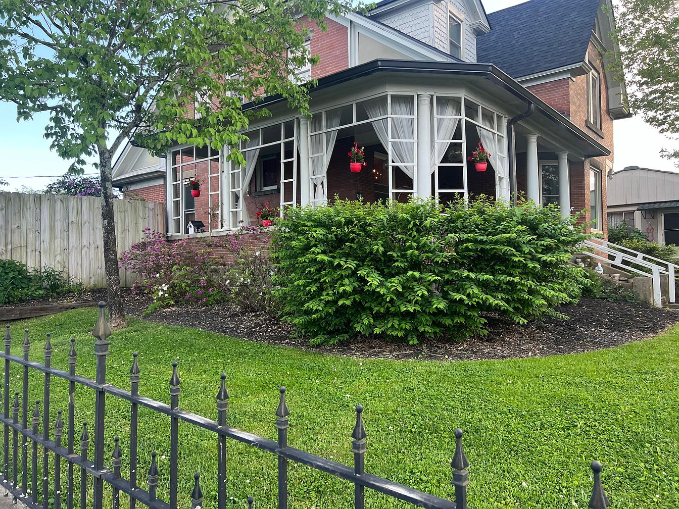 A charming historic American home with a classic brick facade and white siding accents. Multiple gable roofs and a tall brick chimney add character to the architecture. Rows of large, white-trimmed windows line the sunny side porch, creating a bright and airy look. A neatly tended lawn wraps around the house, softened by manicured shrubs and small flowering bushes along the walkway. The front entry features a small triangular portico flanked by lush greenery. An American flag hangs by the door, and mature trees provide gentle shade to one side, enhancing the peaceful and welcoming streetscape.
