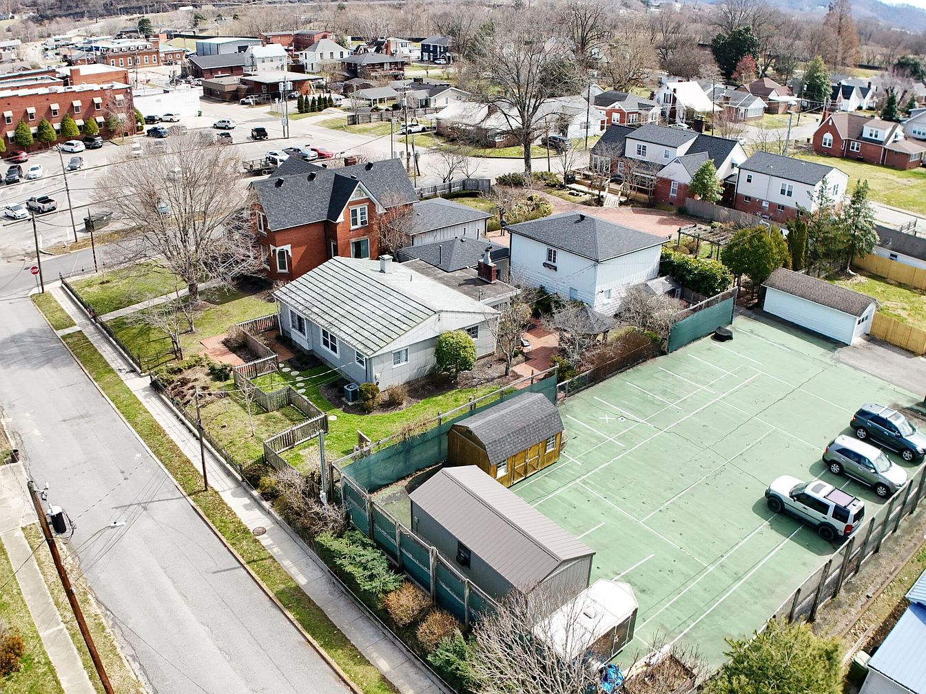 An elevated view of a residential neighborhood displays several historic homes with traditional designs, including brick and wood exteriors. The property in question features a light-gray house with a metal roof, a picket-fenced front garden, and mature trees providing shade. Adjacent is a larger red-brick house with a gabled roof and a matching front porch. Behind the homes is a spacious sports court with faded green markings, likely used for tennis or pickleball, bordered by tall fencing and multiple sheds for storage. The surrounding streets are lined with sidewalks and tidily mowed lawns, creating a neat, community-oriented setting.
