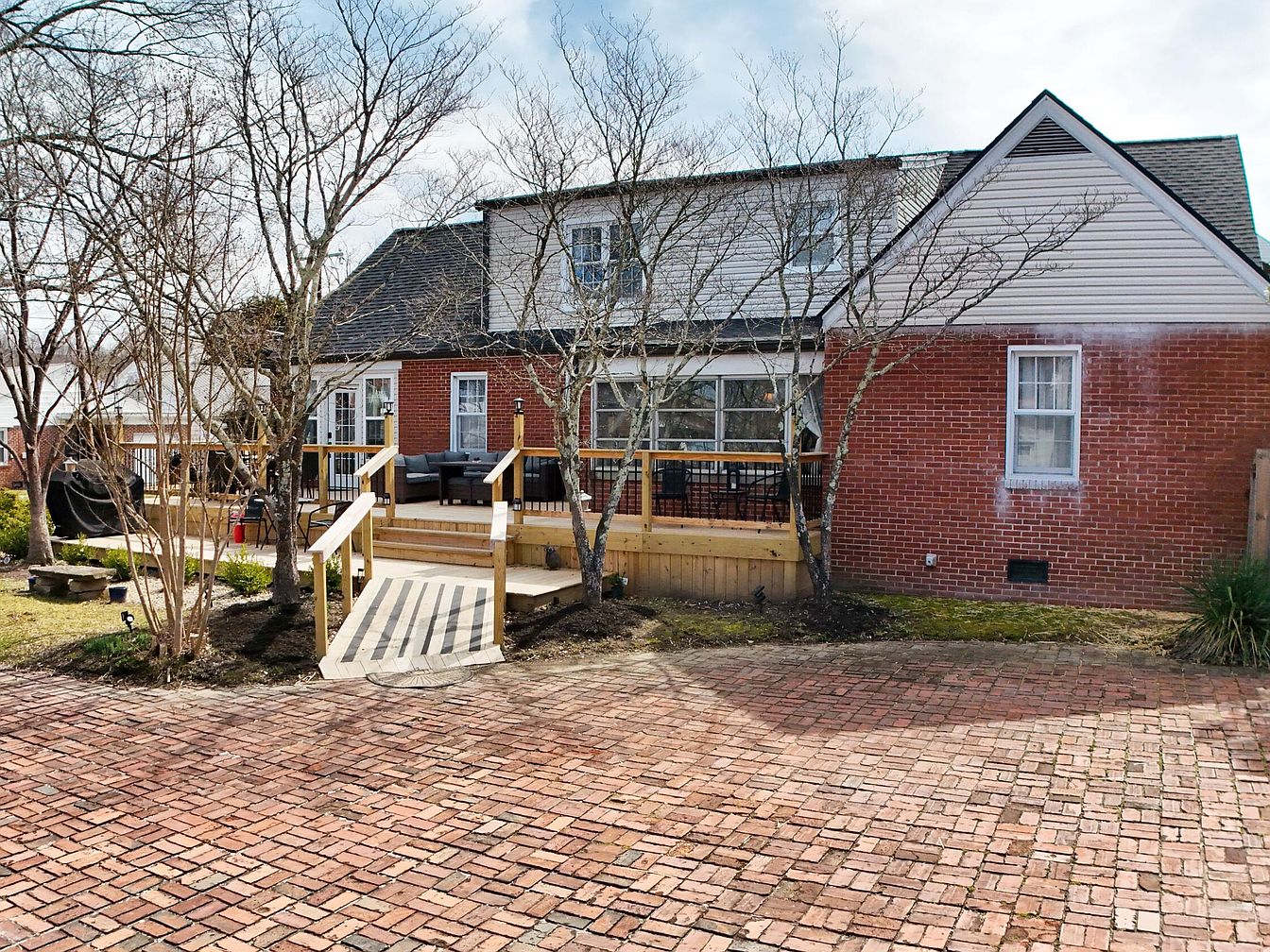 A spacious outdoor area extends from the back of the historic home, featuring a large wooden deck with sturdy railings and wide steps leading up from a brick-paved courtyard. The house exterior combines classic red brick with white siding on the gable, framed by several leafless trees that border the area. Comfortable outdoor furniture is arranged on the deck for relaxation. The ambiance is inviting and blends traditional charm with practical updates, while clean architectural lines and natural landscaping create a harmonious, welcoming transition from the yard to the interior.