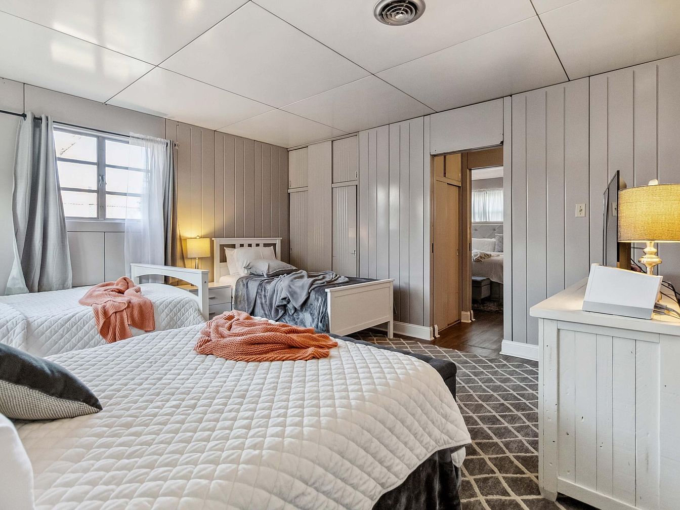 A spacious bedroom featuring two twin beds with crisp white quilted bedding and orange throws placed at the foot. The beds are set against paneled gray walls, which offer a subtle rustic charm. A window with sheer white and gray curtains lets in natural light, softening the room. There’s a small white nightstand between the beds with a lamp, adding warmth. Across from the beds, a white dresser holds another lamp with a golden glow. The flooring is covered with a geometric-patterned gray and white area rug, and a doorway reveals a peek into another softly lit room.