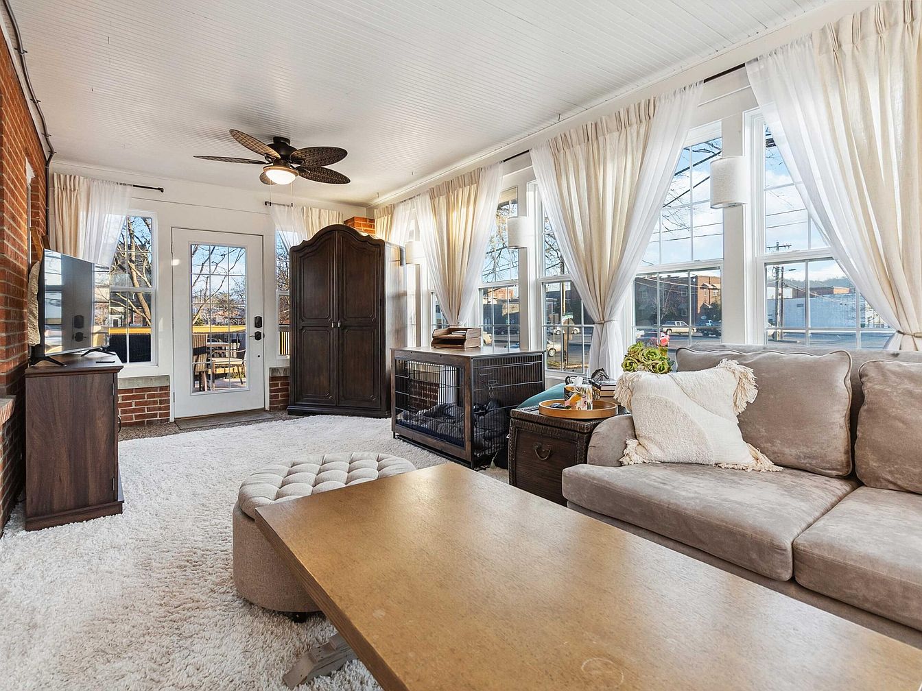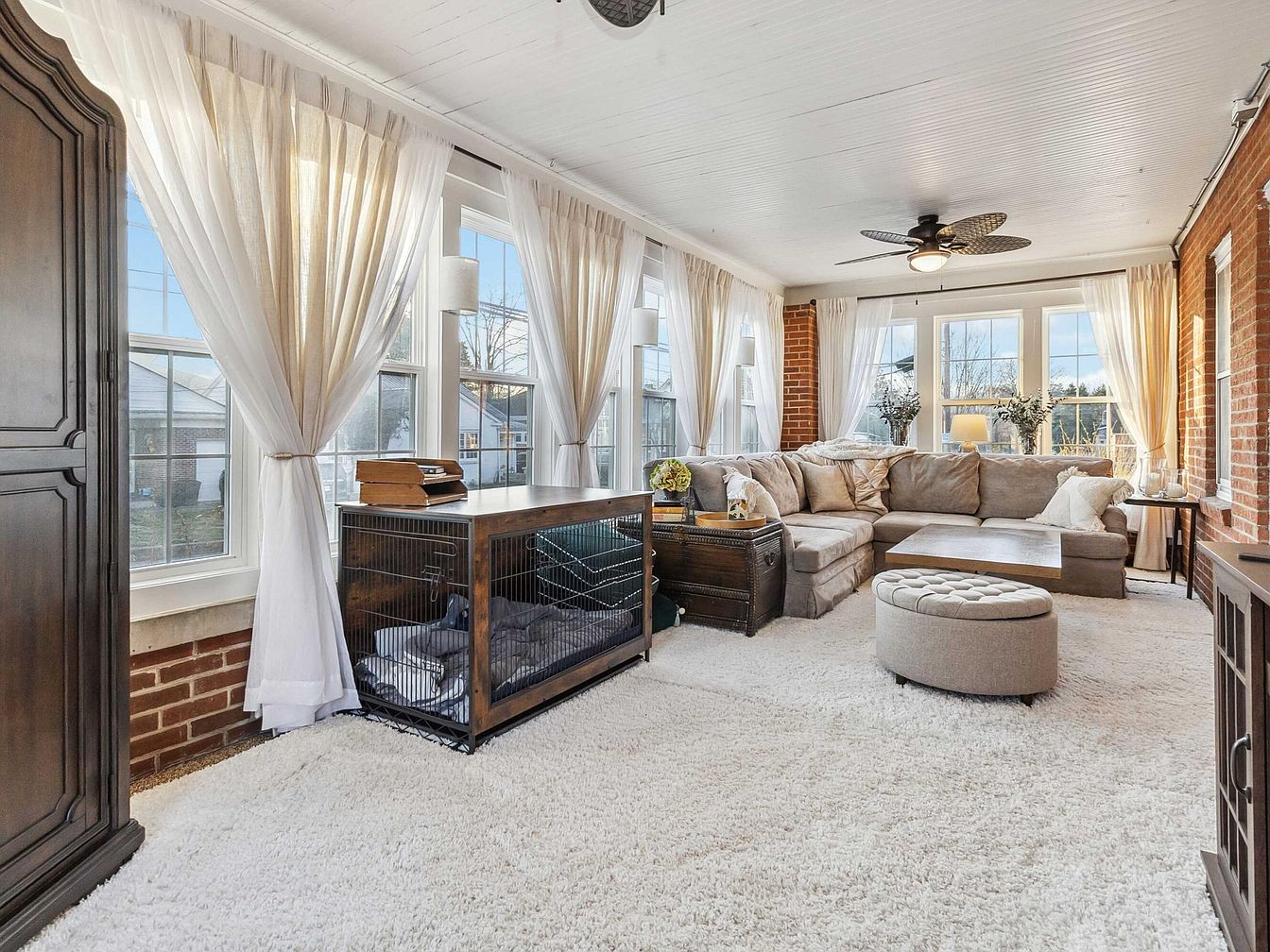 A spacious sunroom features three walls of large windows with sheer white curtains that allow abundant natural light. The brick walls and white beadboard ceiling create a warm yet airy atmosphere. A light beige sectional sofa is positioned in the corner, accented by plush pillows, and faces a simple rectangular coffee table. An elegant, round tufted ottoman sits atop a thick cream-colored carpet. Wood furnishings include a large armoire and a dog crate with a wood frame, blending function and style. Soft lighting, potted plants, and a ceiling fan with leaf-shaped blades add comfort and freshness to the inviting space.