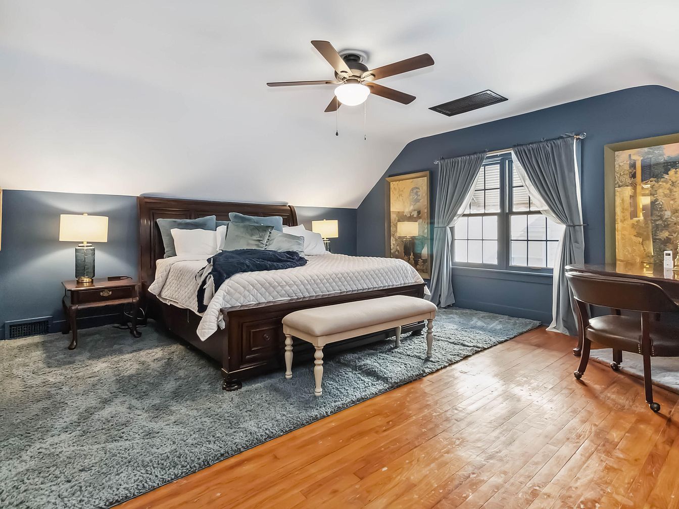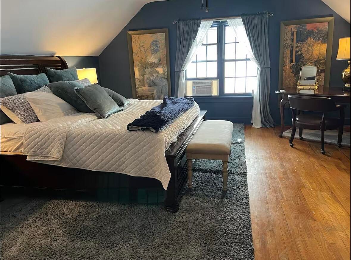 A spacious bedroom features a large, dark wood sleigh bed accented with a mix of white and pale blue pillows and a quilted white blanket. Matching wooden nightstands with blue ceramic lamps flank the bed, illuminating the deep blue-gray walls. The window is dressed in heavy, matching curtains, allowing filtered natural light to brighten the space. Beneath the bed, a thick, plush gray rug covers part of the warm-toned hardwood floor. A cushioned bench sits at the bed’s foot, while a simple wooden desk and leather chair occupy one corner, balancing comfort with function. Artwork flanks the window, adding elegance.