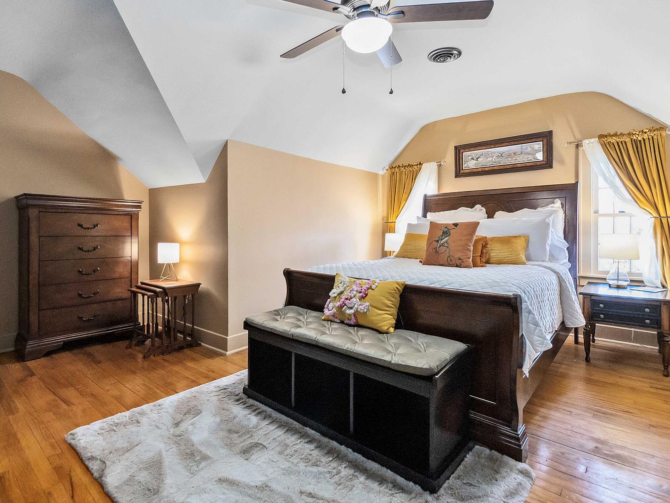 Spacious bedroom with warm honey-colored walls and richly stained hardwood floors. A large wooden sleigh bed is the focal point, adorned with crisp white bedding and mustard yellow accent pillows. Two windows, framed by golden drapes and sheer white curtains, flank the bed and let in abundant natural light. Matching nightstands with table lamps are set on either side. In front of the bed is a tufted bench with floral cushions, sitting on a plush light gray area rug. A high chest of drawers and nesting tables with a modern lamp fill a cozy corner, creating a welcoming, classic ambiance.