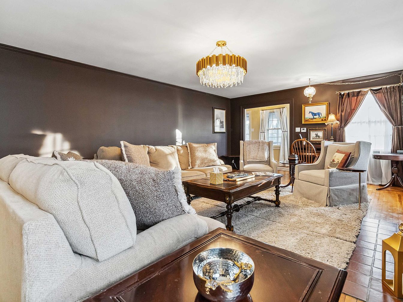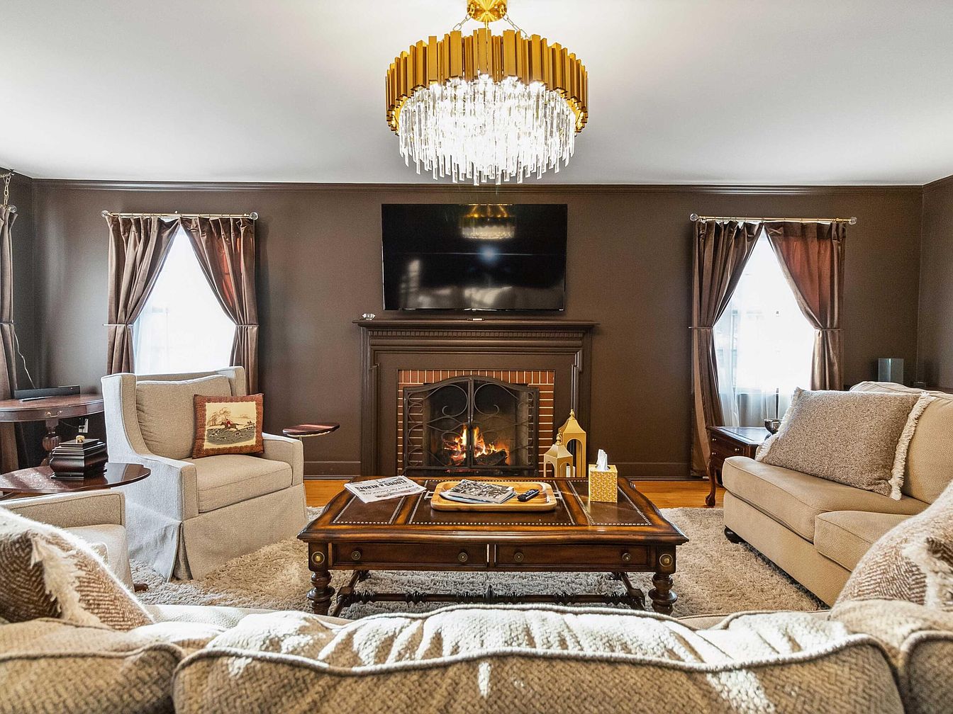 A spacious living room with dark brown walls, contrasted by a white ceiling. Plush cream sofas and armchairs with coordinating throw pillows are arranged around a dark wooden coffee table, which sits atop a soft, textured area rug. A striking gold and crystal chandelier hangs from the ceiling, adding a touch of elegance. The wood flooring is partially visible around the edges, complemented by a small side table with a metallic bowl. Natural light filters in through a window with sheer white curtains and heavier brown drapes, while framed art and classic table lamps enhance the cozy, sophisticated ambiance.