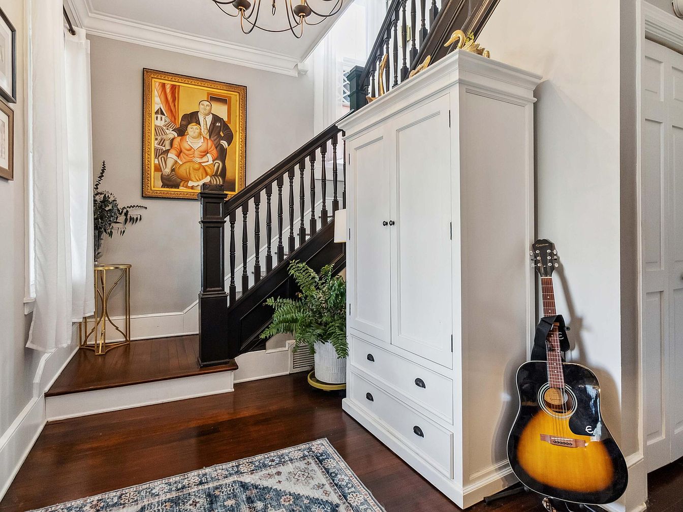 Warm wood floors and a patterned area rug welcome you into this inviting entryway. A stately staircase with glossy black railings and white spindles rises alongside the wall, topped by a large, colorful portrait in an ornate gold frame. Light gray walls pair with crisp white trim for a fresh, classic look. A white armoire with simple black hardware sits next to the stairs, with an acoustic guitar resting against it. Potted ferns and a gold-accented side table add touches of greenery and gleam, while sheer curtains softly filter natural light from the tall window.