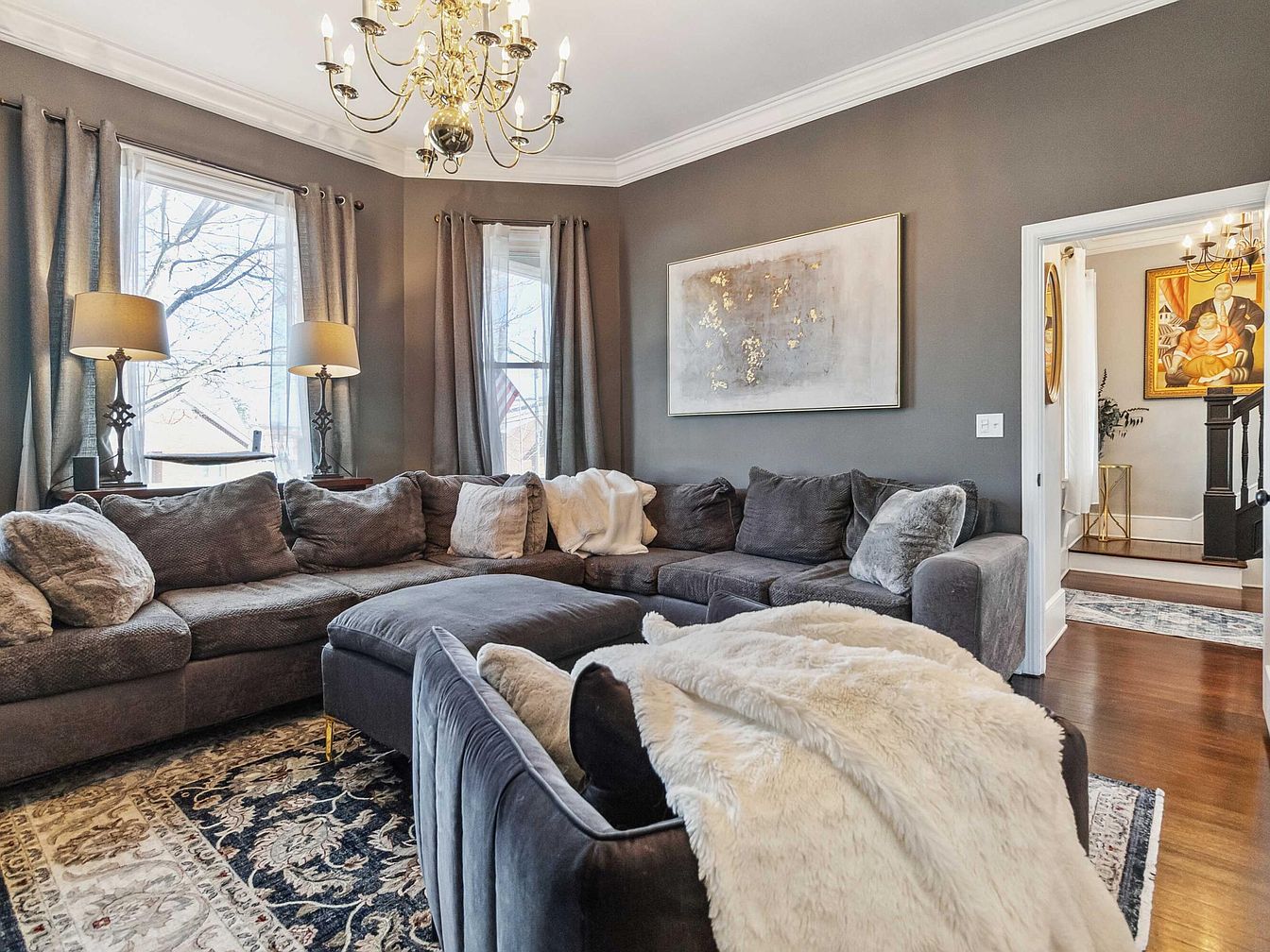A spacious living room featuring dark gray walls and white crown molding for a refined yet inviting feel. A large sectional sofa, upholstered in plush gray fabric, is arranged in an L-shape and draped with soft, light-colored throws and cushions. Floor-to-ceiling windows fill the space with natural light, flanked by heavy gray drapes and topped with matching table lamps on either side. A large, abstract art piece in muted gold and silver tones hangs above the sofa. The room is anchored by a richly patterned area rug in blue and cream, and illuminated by a classic brass chandelier. Through the open doorway, a glimpse of a staircase and vibrant artwork adds depth and color to the home.