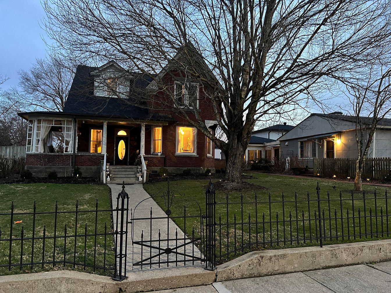 A large two-story brick house sits behind a short wrought iron fence, with a central concrete walkway leading up to broad front steps and a covered porch. The home features a steeply pitched dark roof, decorative gables, and a large bay window on the left. Warm light glows from several windows, contrasting with the early evening sky. A mature tree without leaves stands to the right, partially obscuring the house and casting intricate shadows over the lawn. Neighboring houses are visible on the right, and sparse landscaping frames the home’s foundation, lending an inviting, historic feel.