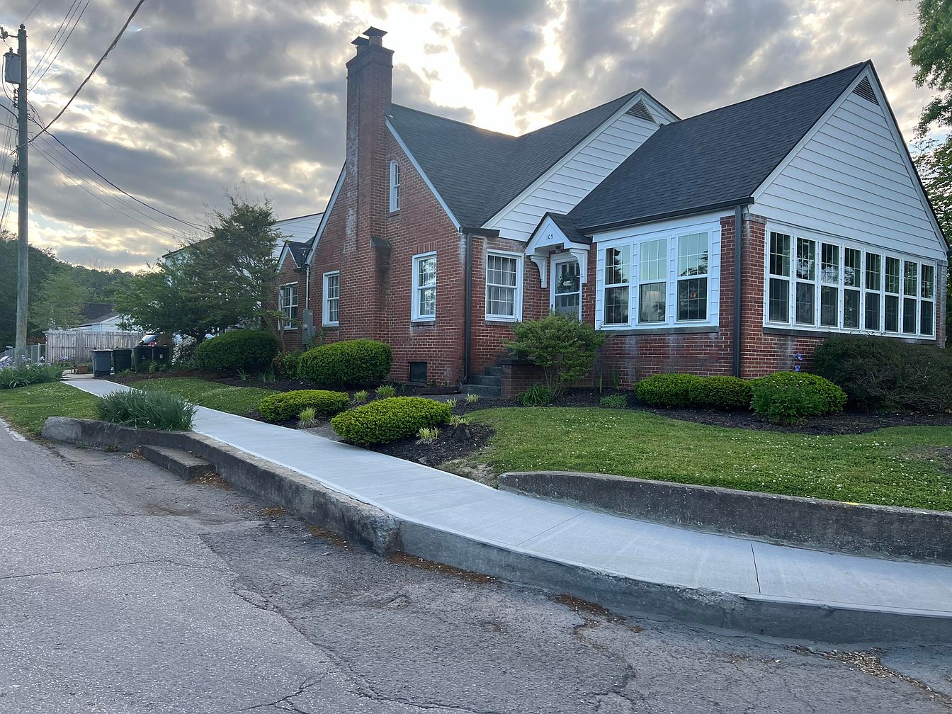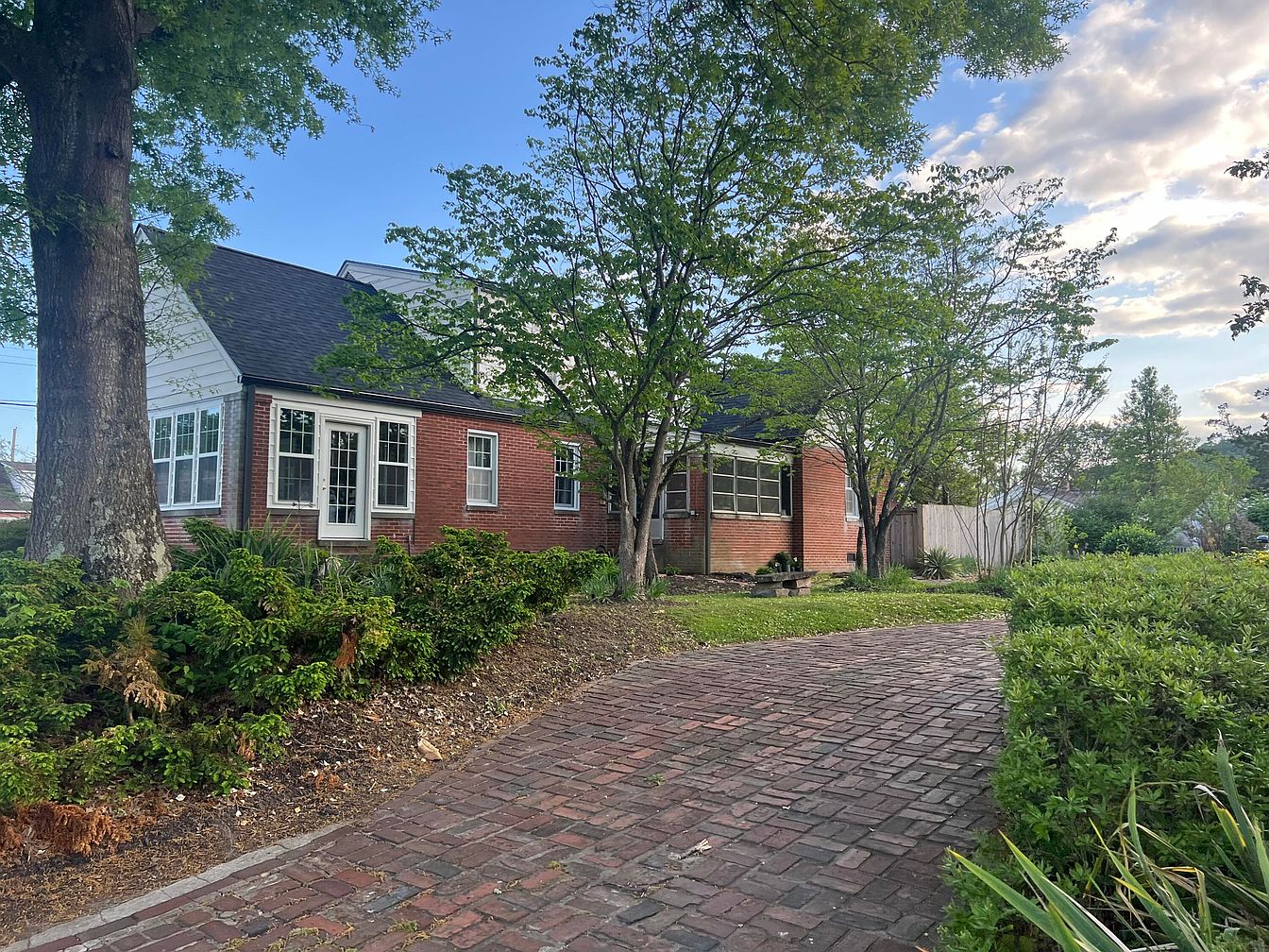 A single-story historic American home with a classic brick façade and steeply pitched gabled roofs. White horizontal siding accents the upper portions and a large enclosed sunroom with many windows extends from the right side. The entrance features a small set of dark steps leading to a modest porch with a decorative white overhang. Well-manicured bushes and shrubs line the front of the house, accompanied by freshly mulched garden beds. A new concrete sidewalk curves through the tidy front lawn, bordering the road. Tall utility poles and a wooden fence are visible to the left, while the sky above is dramatic with streaks of clouds.