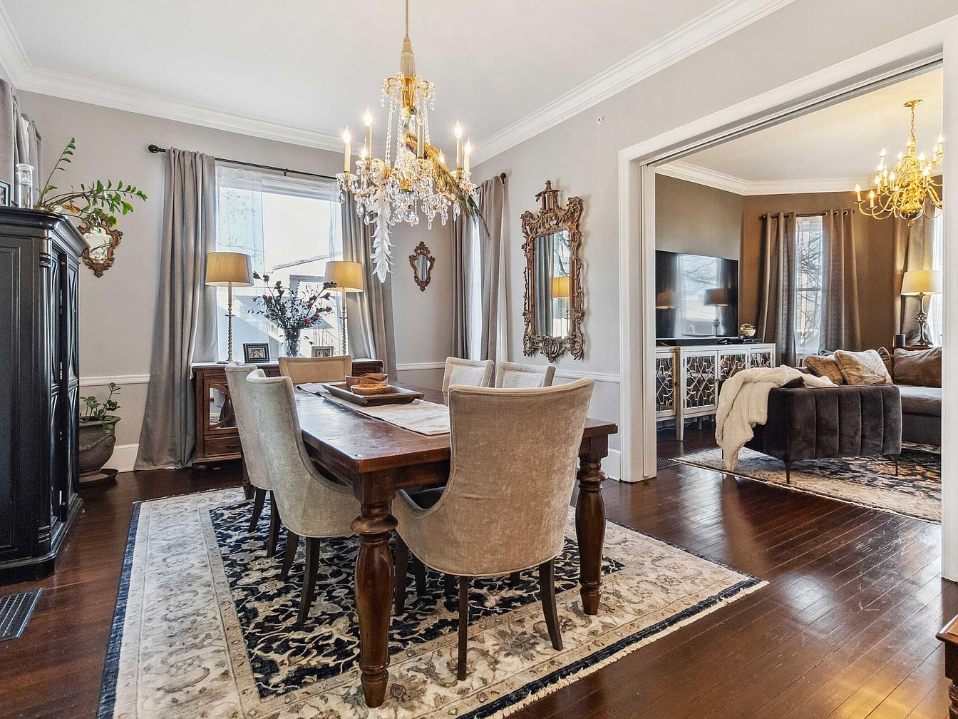 A stately dining room anchors the space, featuring a wooden table surrounded by six upholstered chairs on an ornate patterned rug. The color scheme is elegant, with soft gray walls, crisp white trim, and rich dark wood flooring. Crystal chandeliers hang above both the dining area and adjoining parlor, casting a warm golden light. Tall windows are dressed with flowing gray curtains, allowing natural light to brighten the space. Decorative mirrors with ornate gold frames and a pair of matching lamps grace the walls, while a black armoire and potted plant add depth and character. The adjacent parlor features a plush dark velvet sofa and continues the refined, harmonious aesthetic.