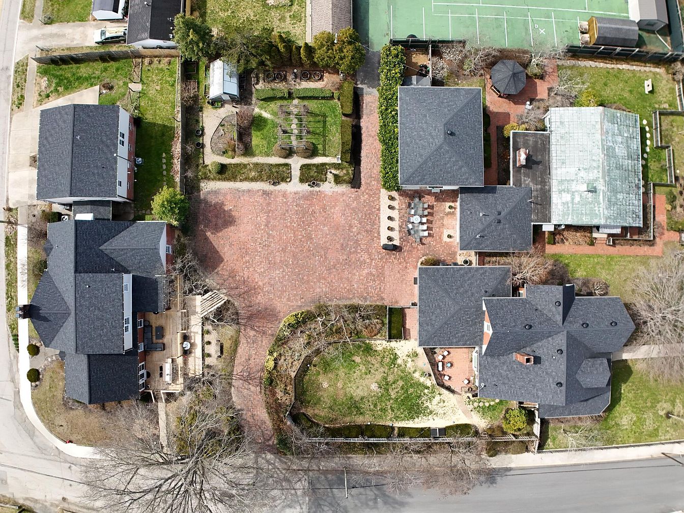 Bird’s-eye view of a historic property highlighting multiple structures arranged around a large central brick courtyard. The courtyard features open areas for gathering, bordered by a mix of mature trees, hedges, and landscaped gardens. Several homes and outbuildings surround the courtyard, each with dark gray or weathered roofing. Outdoor patios with seating, dining areas, and a tennis court are visible, as well as pathways that connect each structure. Gardens are laid out in geometric designs, with raised beds and circular planting areas. The scene displays an orderly, campus-like aesthetic with a blend of red brick, greenery, and historic architectural charm.