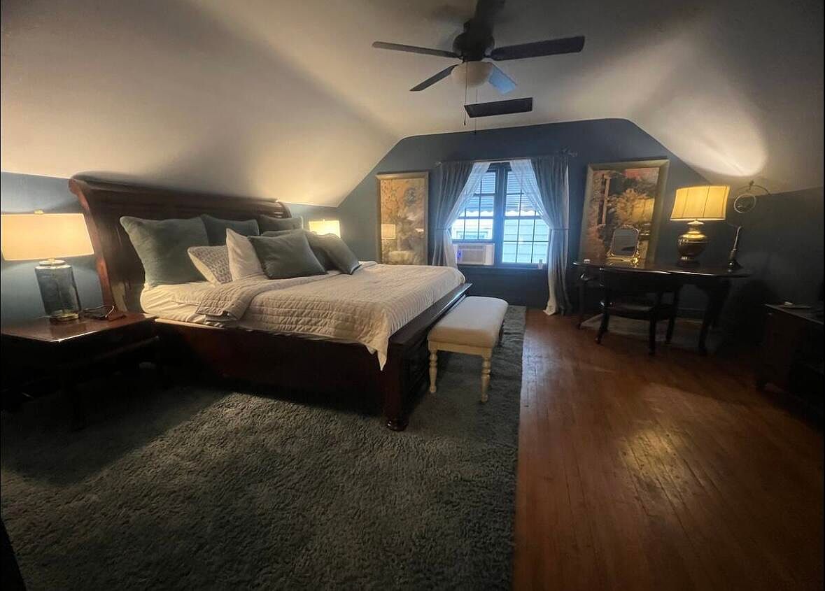 A cozy, inviting bedroom with angled ceilings painted in a soft blue shade, creating a calm and restful atmosphere. The main focal point is a large wooden sleigh bed accented with fluffy white bedding and sage green throw pillows. Matching end tables with elegant lamps flank the bed, lending symmetry. A plush blue area rug adds comfort and color, complementing the pale walls. Near the back, a classic wooden vanity with an ornate mirror sits between two vintage gold-framed artworks, both softly lit by table lamps. Large windows with flowing curtains let in natural light and provide views outside, enhancing the room’s serene appeal.