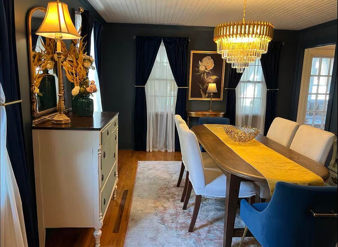 A long rectangular wooden dining table sits at the center, surrounded by six upholstered chairs in two shades: white and blue. The table is accented by a golden runner and a decorative gold bowl. Overhead, a striking chandelier with gold and crystal elements casts a warm glow. The walls are painted dark blue, contrasting with white trim and ceiling. Rich navy curtains frame tall windows, softened by sheer inner drapes. A sideboard to the left holds a gold lamp and floral arrangement beneath a gold-framed mirror, while a painting and another lamp create a balanced, elegant space with historic charm.
