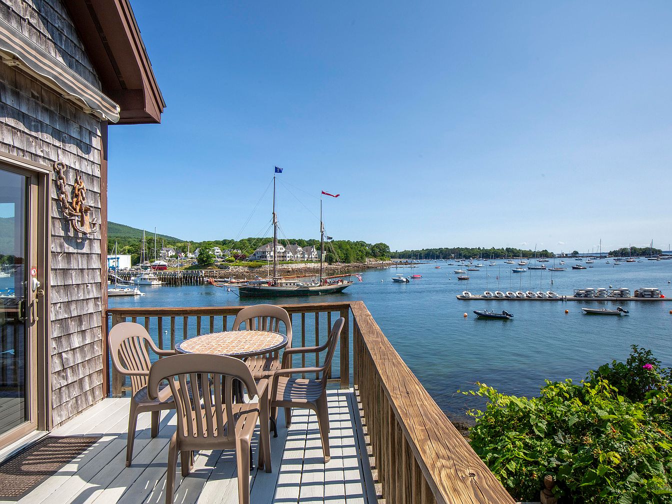 The image showcases a delightful waterfront deck terrace, featuring a round table surrounded by four simple plastic chairs. The deck is made of light-colored wood, contrasting with the darker wooden railings. A serene view stretches across a calm bay dotted with boats, while lush green hills rise in the background under a clear blue sky. Architectural details include a wooden shingle exterior and an awning above the door, blending with the natural scenery. The inviting arrangement suggests a perfect spot for relaxation, enjoying sunlight, or sharing meals while taking in the panoramic waterfront vista.