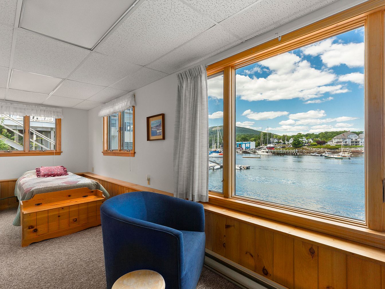 This cozy bedroom features a warm wooden aesthetic, highlighted by natural wood paneling that borders the room. The large windows allow plenty of natural light and showcase a picturesque waterfront view, including boats and lush greenery. A single bed with a multi-colored quilt adorned with pink accents is placed against the wall, accented by a wooden storage bench at its foot. A blue accent chair adds a pop of color, contrasting against the neutral beige carpet. Framed artwork on the wall complements the understated decor, creating a serene and inviting atmosphere.
