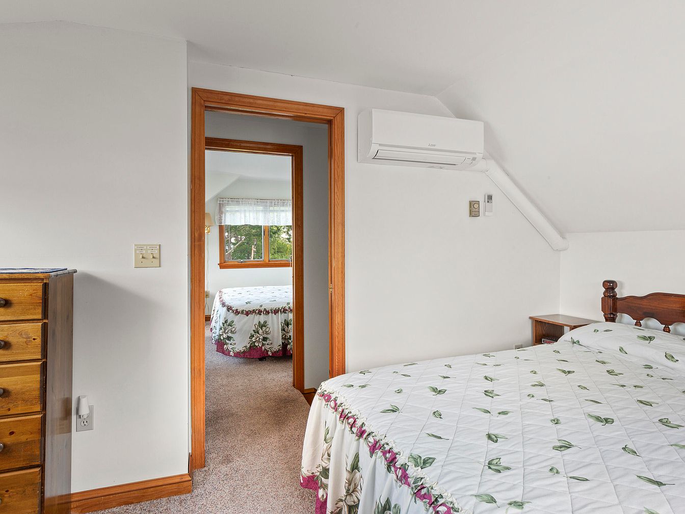 A cozy bedroom space featuring a warm, inviting color palette dominated by soft whites and pastel floral patterns. The bed is adorned with a delicate quilt showcasing green leaves and pink floral accents, complemented by a wooden headboard. Adjacent to the bed, a wooden dresser provides functional storage. An open doorway reveals another furnished space, enhancing a sense of connection within the home. Natural light pours through the window, illuminating the cozy interior. The architecture includes sloped ceilings, giving the room a charming, attic-like feel. Soft carpeting adds warmth underfoot, creating a comfortable atmosphere.