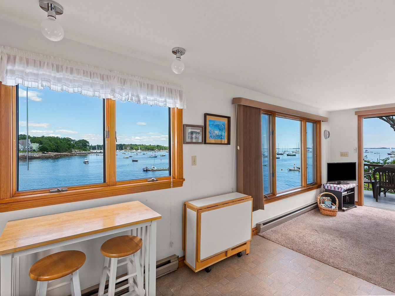 The sunroom features large windows framing a picturesque waterfront view, showcasing boats on calm waters and greenery beyond. Warm wooden accents in the window frames enhance the airy atmosphere. A simple wooden countertop with stools invites casual dining, while a small TV and a basket add practicality to the decor. The floor is tiled with a soft beige tone, complementing the light-colored walls. Soft carpets in a neutral shade provide comfort underfoot. Natural light floods the space, creating a cozy, inviting environment perfect for relaxation or casual gatherings, seamlessly blending indoor comfort with outdoor beauty.